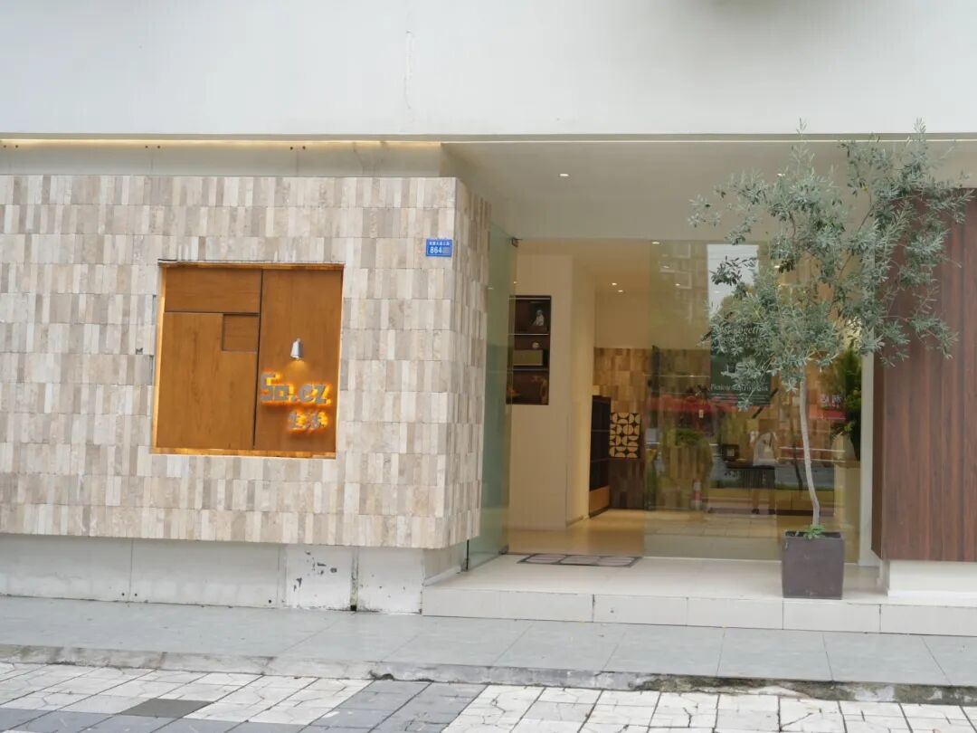 So.ez生活馆店招以大面积拼贴瓷砖嵌以实木装饰为背景,店招字样小巧精致,柔和灯光下,呈现出丰富的层次感。