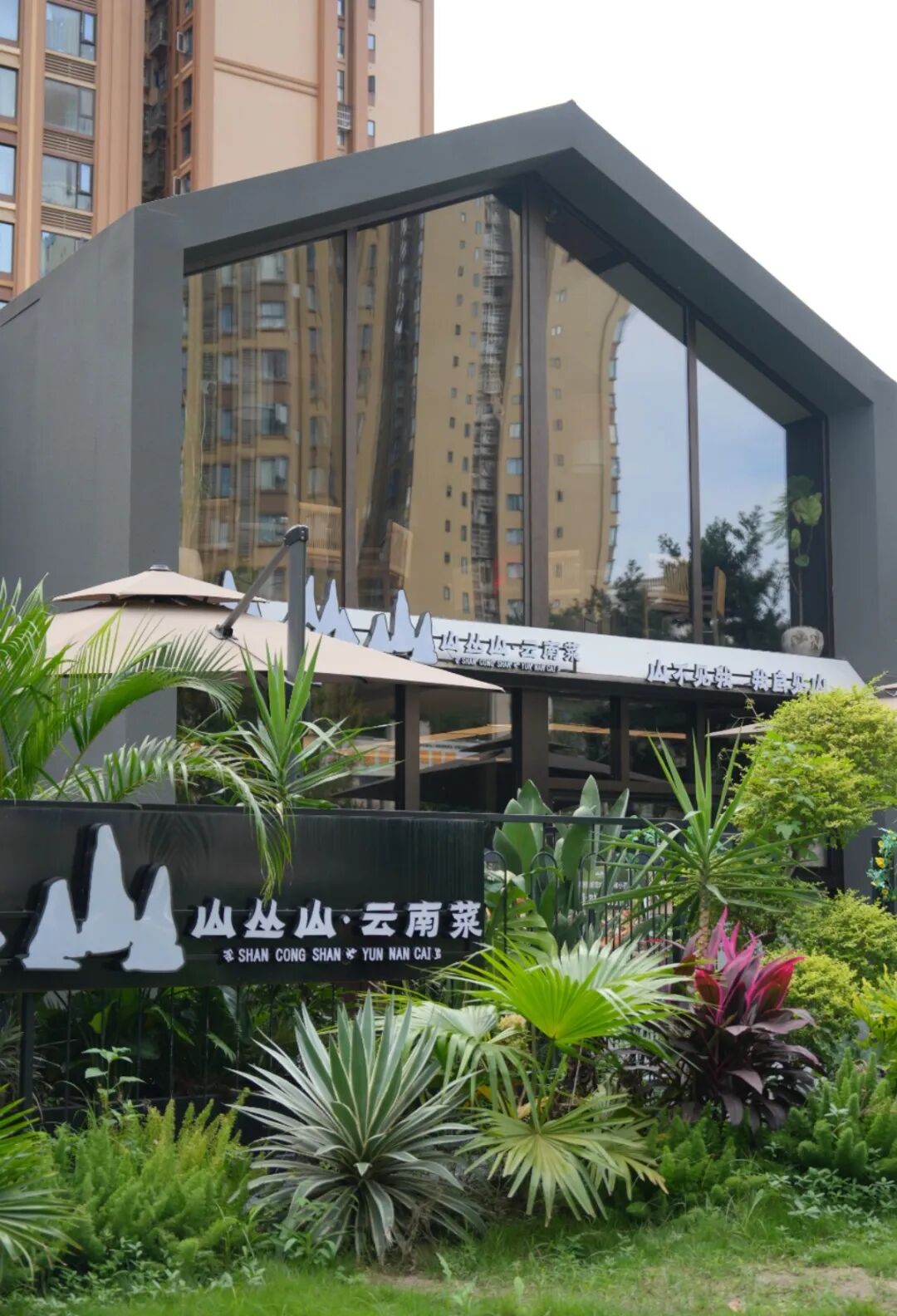 坐落在街区微绿地中的山丛山云南菜(温江店),深色调外立面、大面积通透玻璃窗和向外延展的木制平台,将旁侧的公共绿地巧妙地“借”为己景。围栏外与门头上的店招设计简约,有机融入城市空间,白色的发光字体在夜幕中点亮,吸引着客流如织。