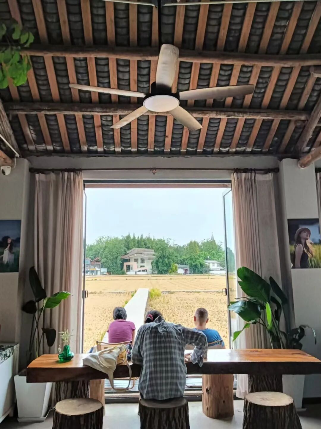 在万春镇和林村,“稻语咖啡”的全景落地窗将整片稻田装裱成一幅巨幅动态油画。店内,来自不同地方的游客自然地拼桌围坐,聊着天,格外热闹。