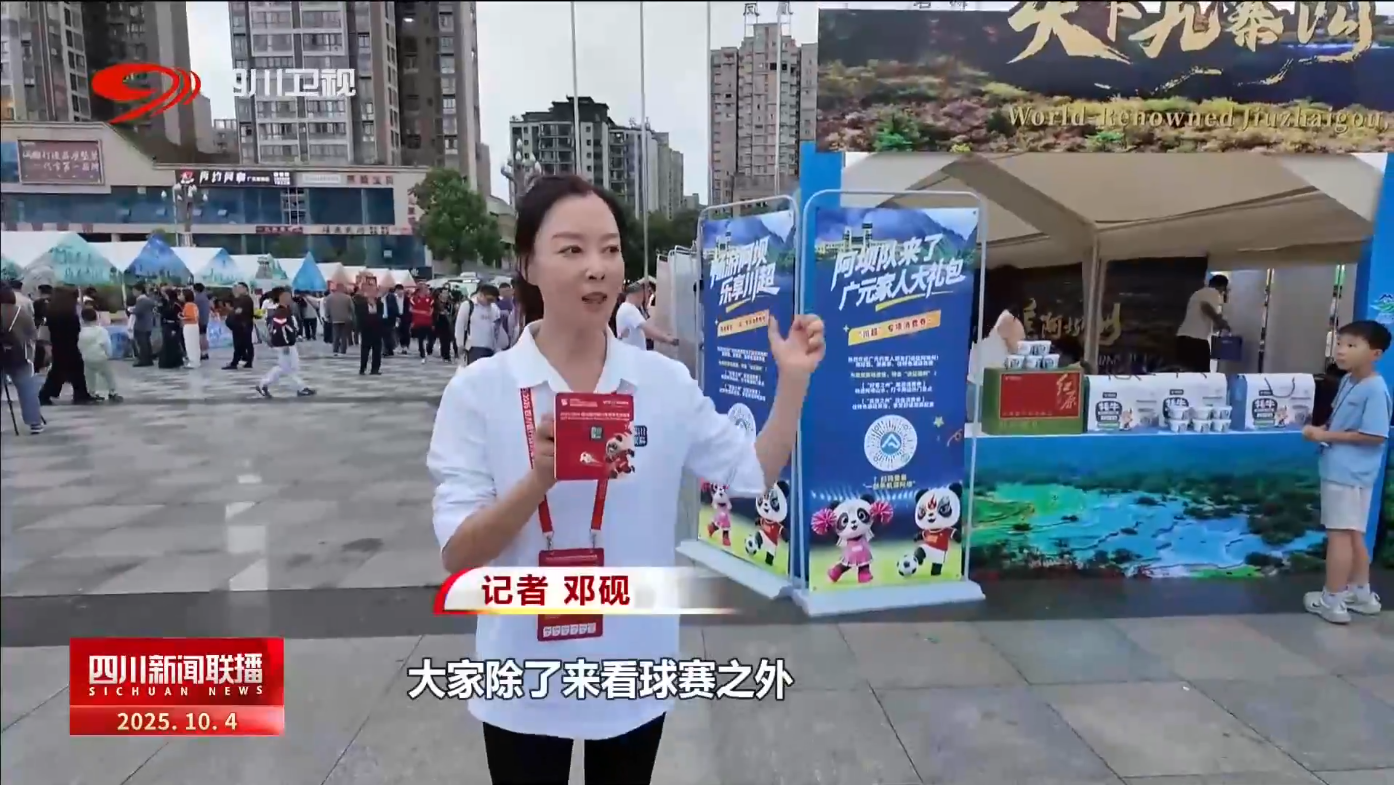 记者 邓砚:在广元澳源体育中心的广场上,已经聚满了游客和球迷,大家除了来看球赛之外,也是来旅游的,请看一下天下九寨沟,大美阿坝州的这些特色产品已经就位。