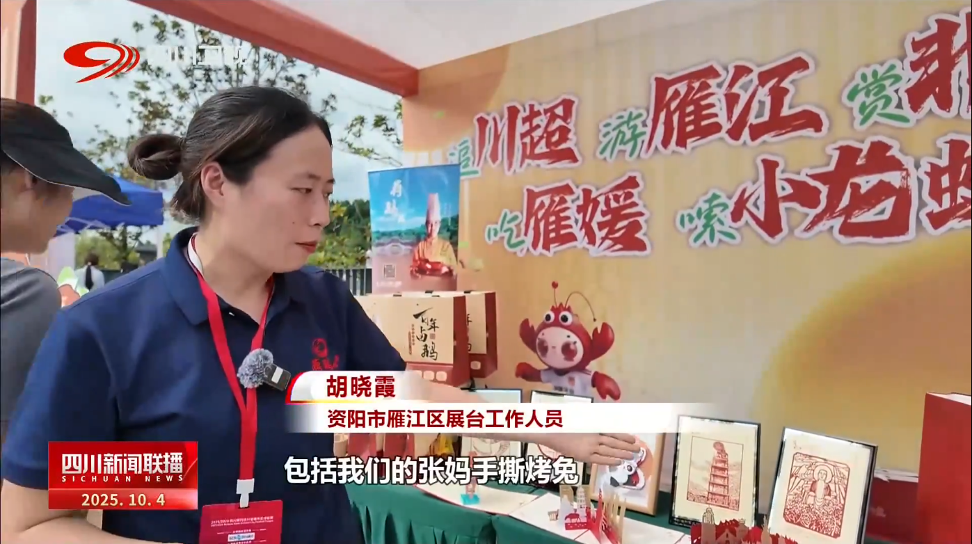 资阳市雁江区展台工作人员 胡晓霞:这边是我们雁江区的东风剪纸,包括我们的张妈手撕烤兔,都是我们的非遗产品。