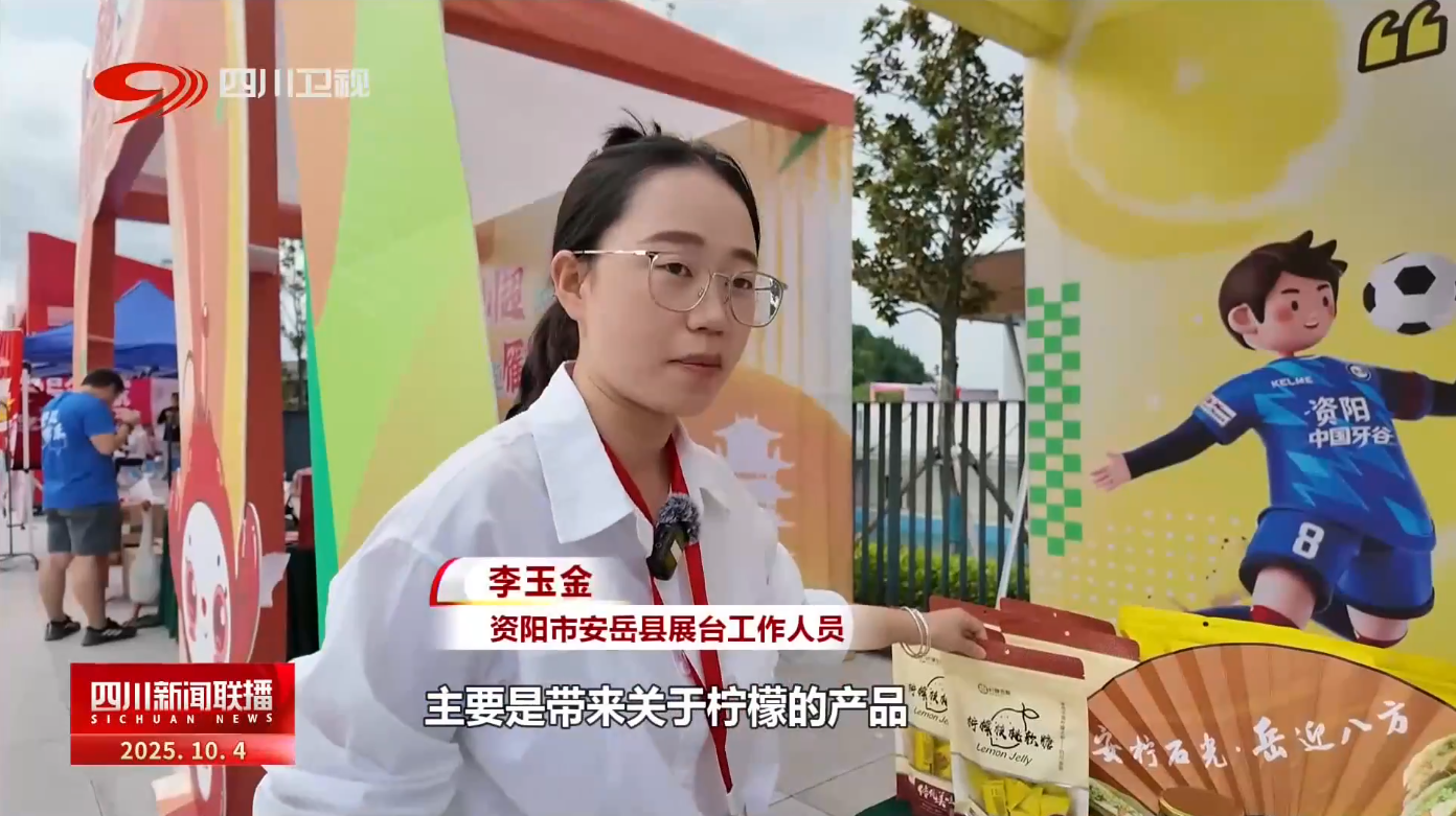 资阳市安岳县展台工作人员 李玉金:主要是带来关于柠檬的产品,这边是柠檬核桃软糖、这个是用柠檬做的果酱、我们的柠檬小包,非常可爱。