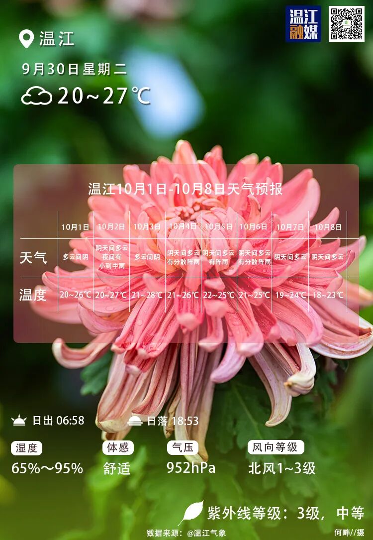 10月2日(周四)阴天间多云,夜间有小到中雨,气温20~27℃;