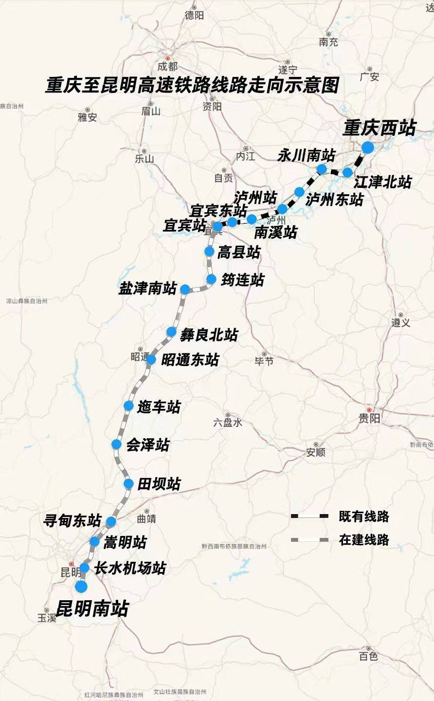 渝昆高铁是我国“八纵八横”高铁网京昆通道的重要组成部分,线路起自重庆西站,途经重庆市、四川省、贵州省和云南省,接入昆明南站,全长约700公里,设计时速350公里。
