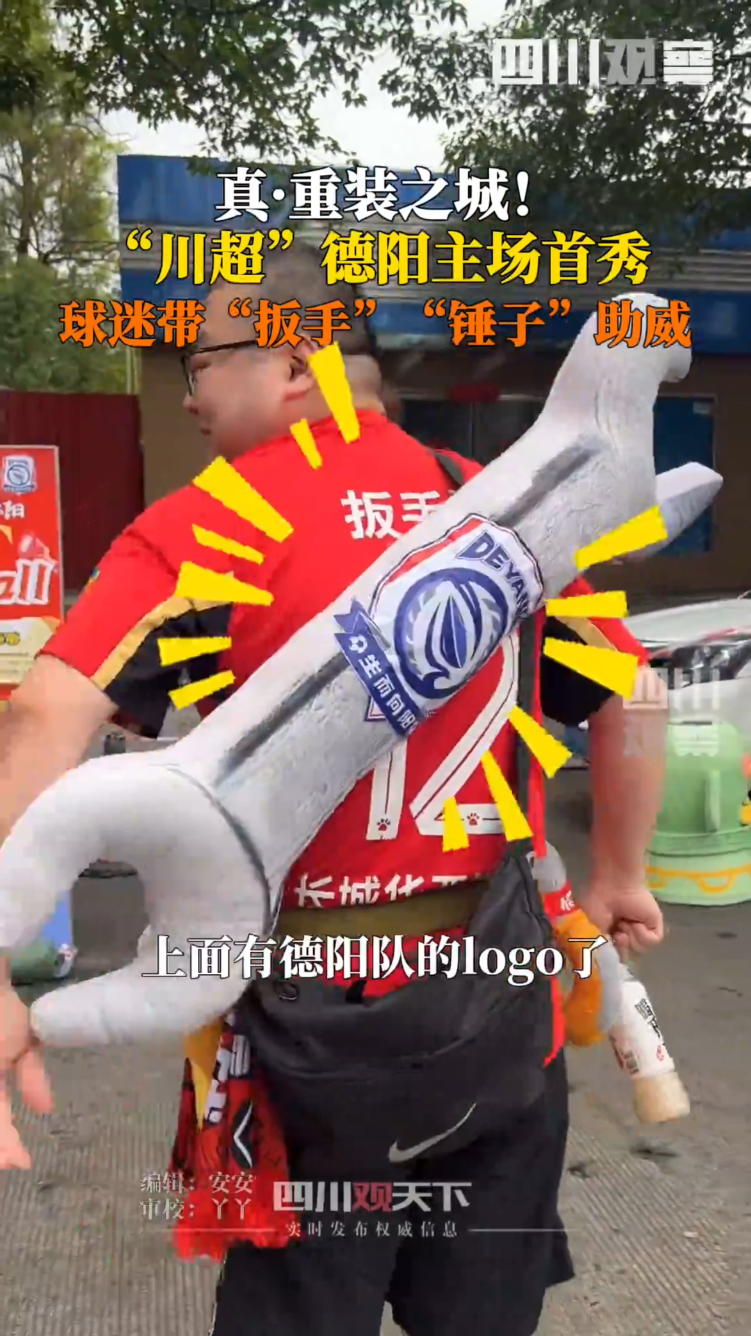 德阳重装队终于在本轮迎来了主场首秀,来自“重装之城”的球迷们也“不装了”“摊牌了”,高调到把“扳手”“榔头”和“钳子”都挂在了身上。诶,这可不是电影《少林足球》里“沙地烂仔队”球员们拿的“真家伙”,而是造型可爱的“萌版”工具。它们既象征着坚韧不拔的城市性格,也演绎了一出“一把手”的谐音梗。