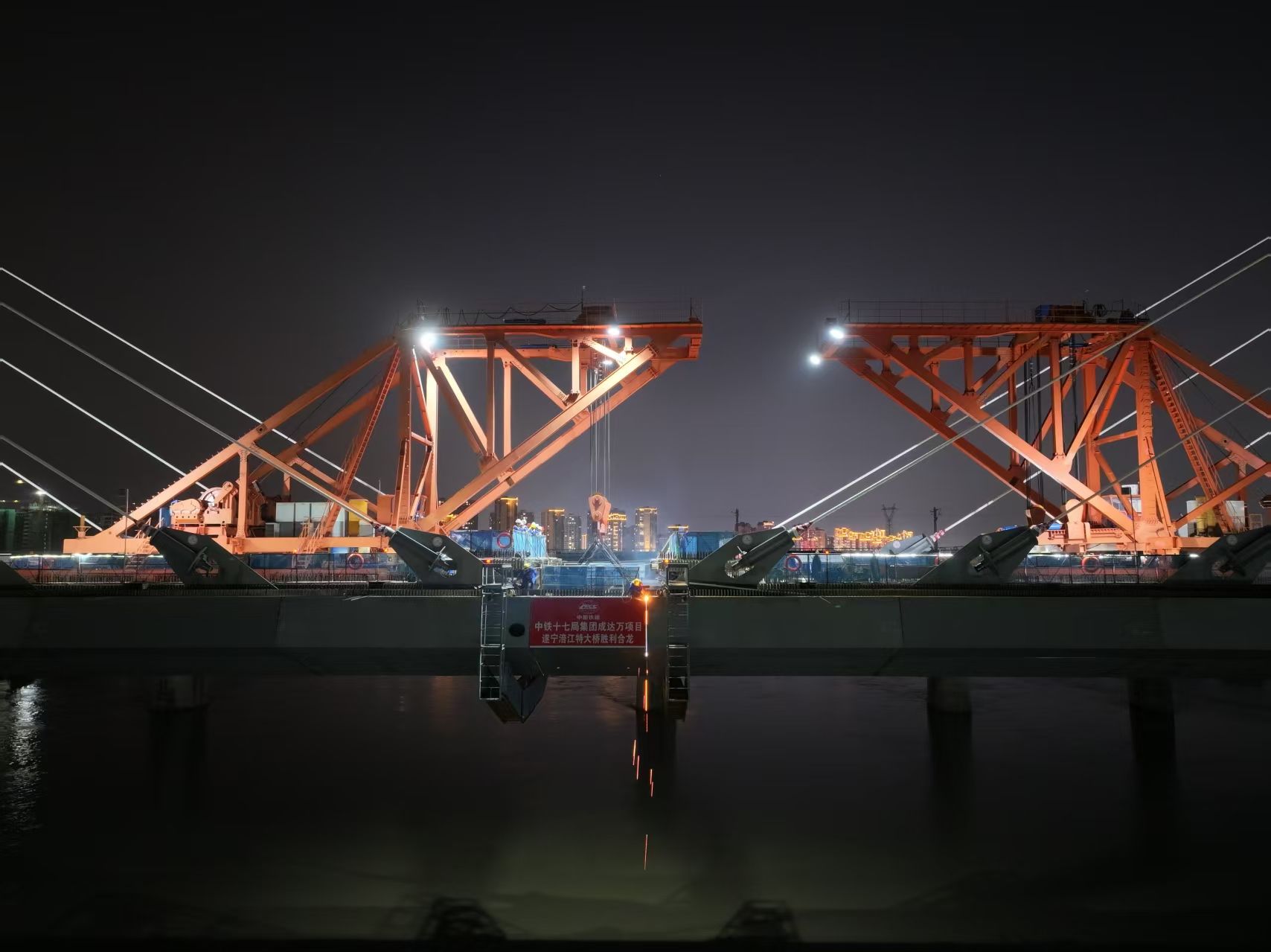 记者从成达万高铁公司获悉,10月14日,随着最后一节钢箱梁经过32小时的吊装和焊接,标志着成都至达州至万州高速铁路(以下简称:成达万高铁)全线控制性工程遂宁涪江特大桥顺利合龙,为成达万高铁按期通车奠定了坚实基础。