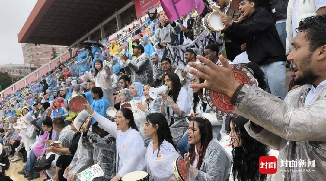 来自孟加拉国的21岁小伙寒山(中文名),是大家的摄影师。一手拿稳定器和相机,一手撑伞为设备遮雨,透过他的镜头,记录下大家在现场一次次呐喊、一次次鼓掌、一次次欢呼。中场休息时,大家还跳起舞来,格外兴奋。“So high!”“太嗨了!”寒山一边拍摄记录,一边加入大家。