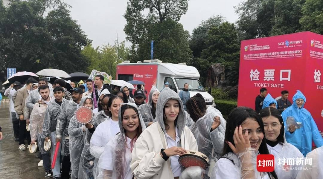 “川超”川东赛区第五轮较量,南充丝绸源点队主场迎战成都锦城队。这场比赛,被球友称为“川东赛区终局战”。从赛程发布,这场球赛就备受关注,仅大麦网售票平台,就有近2万“预约想看”。下午2时许,检票入口处,迎来一群特别的球迷。他们肤色各异,穿着雨衣,拿着手鼓、腰鼓等乐器,走向西区看台。