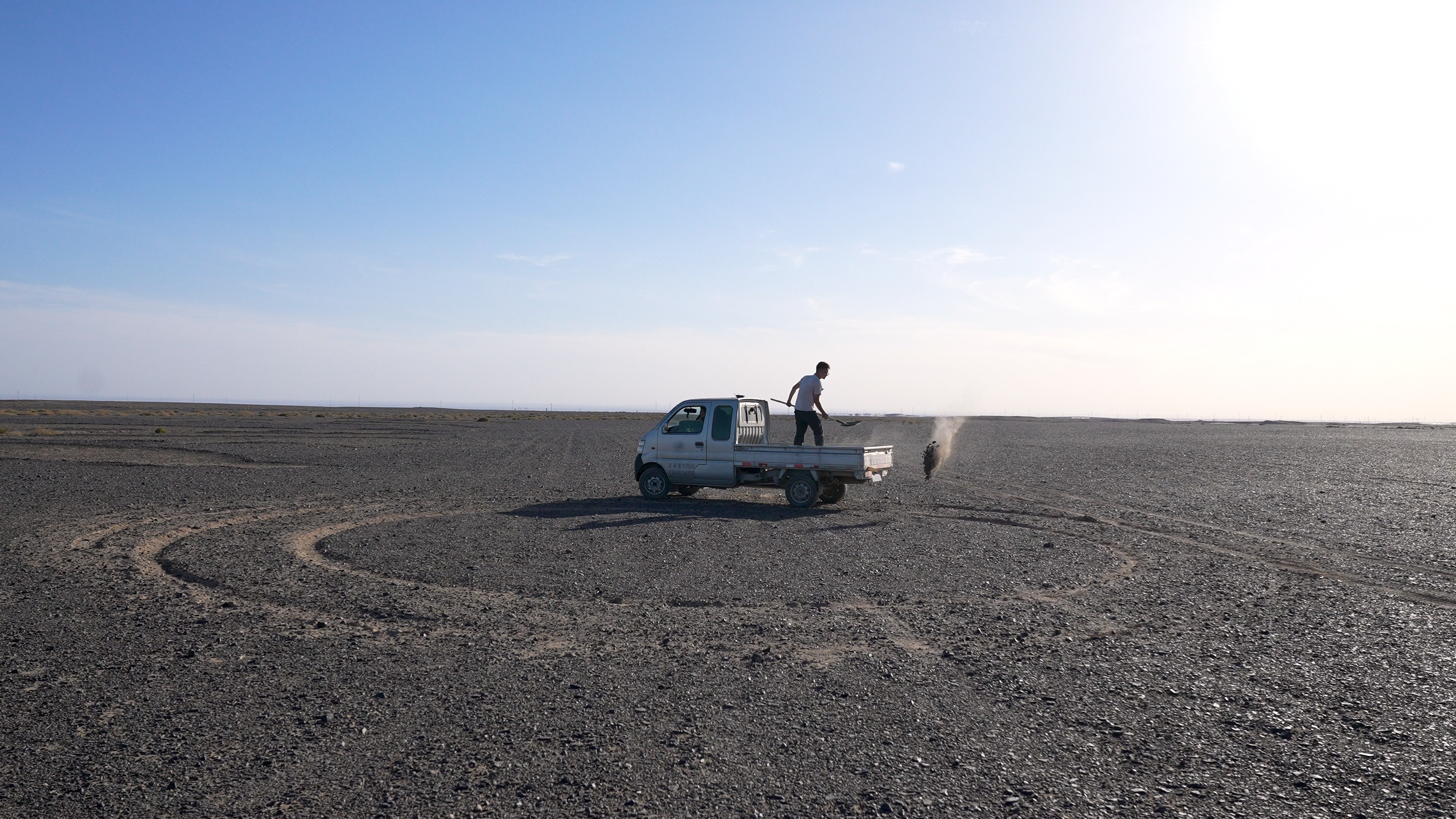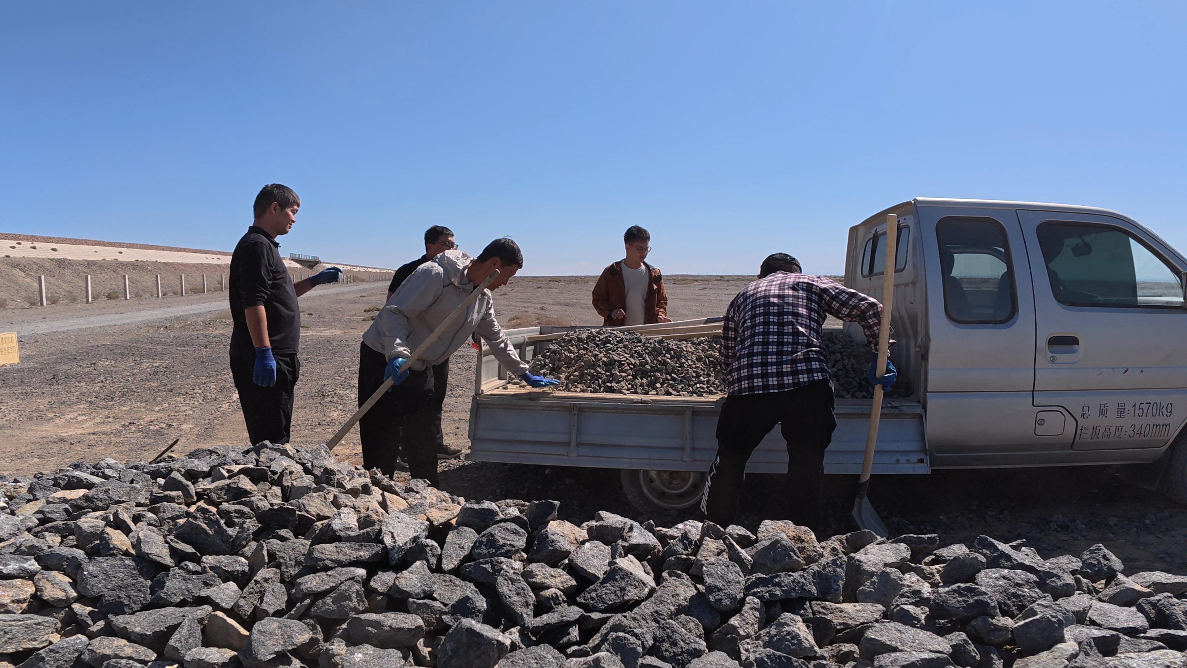陆遥:为了保护戈壁脆弱的生态。我们特意把满载石料的大货车停在距离修复地点3公里外的地方,然后用小货车一点点地转运,像蚂蚁搬家一样。戈壁表面的黑色砾石层只有薄薄一层,下面是很厚的碱土,这种地貌需要上百年才能形成。一旦被重型车辆碾压,痕迹几乎无法消除。有人建议“把压进去的石头抠出来就行了”,但实际情况要复杂得多。我们宁愿自己多跑几趟,也要尽量减少对环境的破坏。
