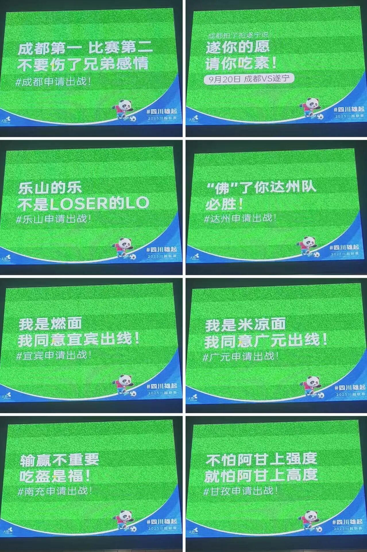 幽默,是城市间最亲切的“放狠话”。自贡对宜宾:“输了不给燃面放盐?”宜宾轻松接招:“宜宾有哪吒,自贡有恐龙,看拿抓擒龙!”成都对遂宁,成都喊话:“听说死海很咸?我们守门员也很闲(咸)!”遂宁霸气回应:“守门员闲?来死海泡温泉!就让成都一直‘漂’!”言语间刀光剑影,满是城市间充满智慧的互动与共鸣,看似挑衅,其实都在玩心机,借比赛夹带私货卷文旅呢。