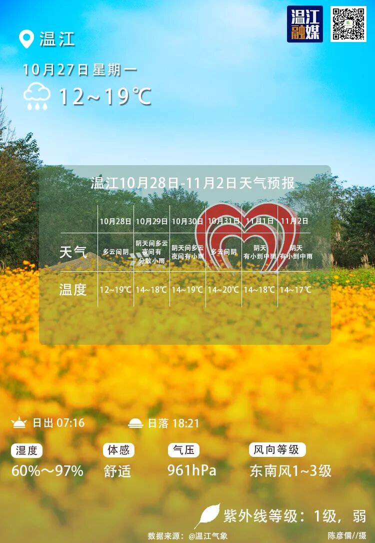 10月27日(周一)小雨转间多云,气温12~19℃;