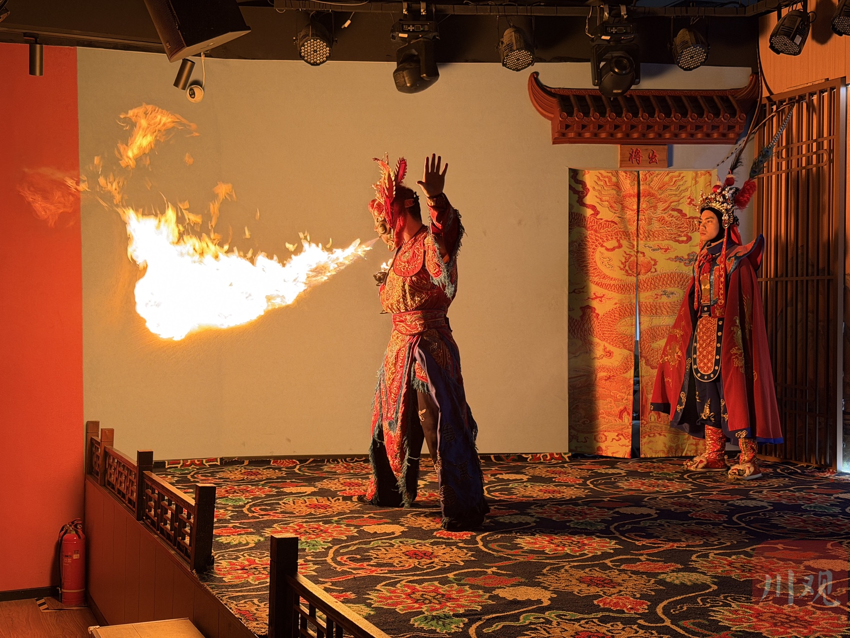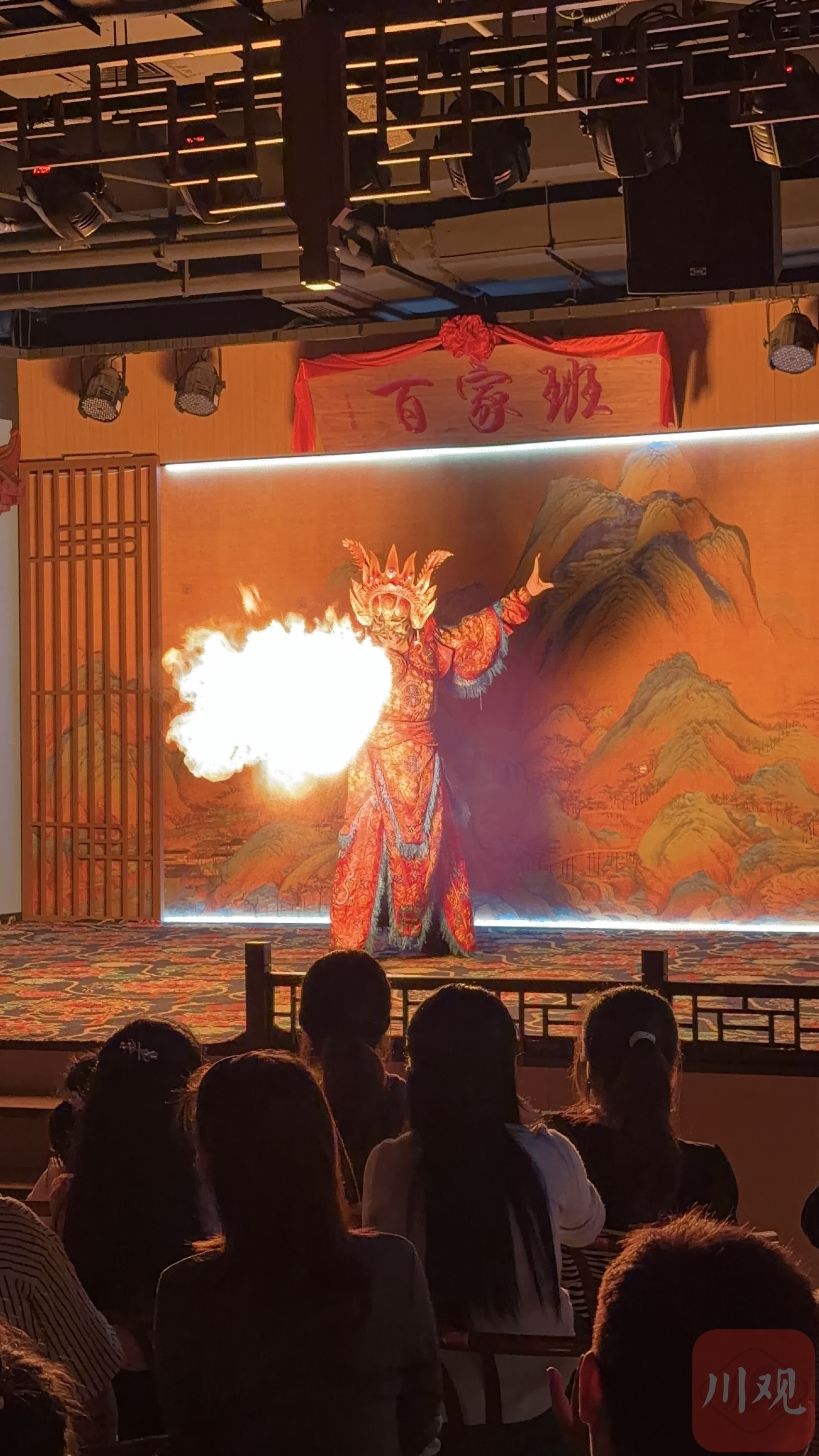我们在采访现场看到,演出开始,随着锣鼓声响起,年轻演员们身着戏服登场。第一个节目是刀马旦,女演员头戴翎子,双手握枪,手腕快速转动,银枪时而绕着身体盘旋,时而被抛向空中又瞬间接住,台下爆发出阵阵掌声。之后手影戏、三岔口、功夫茶艺、皮金滚灯、水袖舞、变脸、吐火等节目轮番上场。特别是当演员表演变脸、吐火绝技时,剧场内气氛达到高潮,欢呼声与叫好声交织在一起。