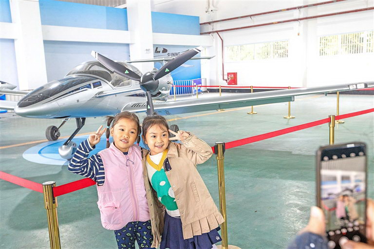 萌娃与民航飞机同框,点燃“小飞行员”的航空梦。