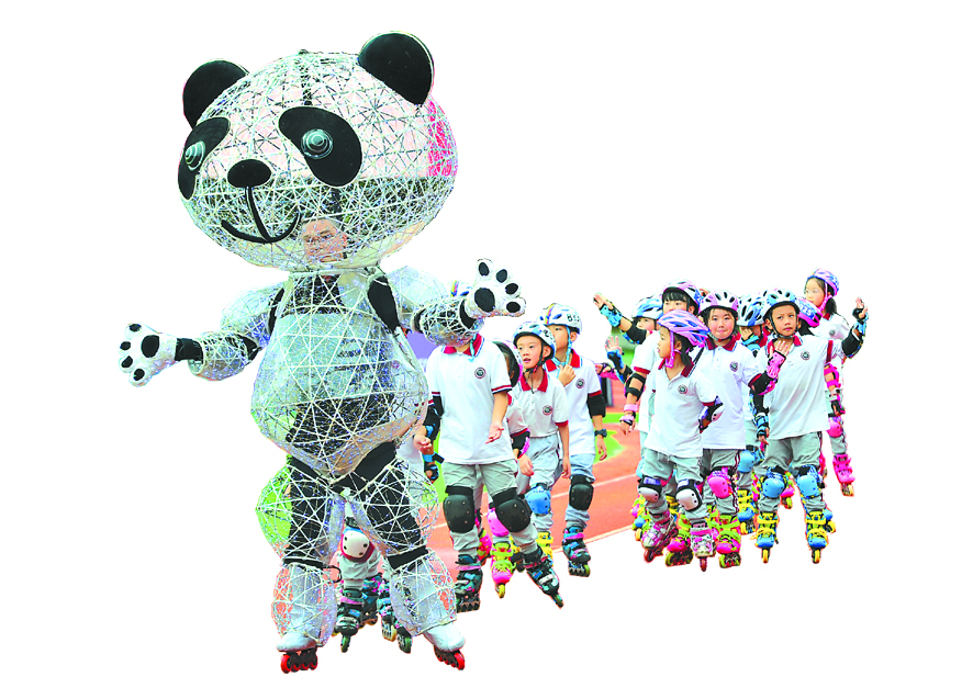 10月2日,南充主场开赛前,曾亮相韩国平昌冬奥会闭幕式“北京八分钟”的川北大木偶“熊猫队长”亲临现场,在一群轮滑少年的簇拥下灵动起舞。这是继9月20日晚川北大木偶在“川超”揭幕战上惊艳亮相后的又一次精彩展示。