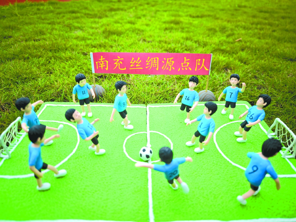 “川超”开赛以来,不少南充非遗传承人也积极参与,以自己擅长的非遗技艺为南充丝绸源点队加油助威。近日,记者在西充县多扶镇“王安斌泥塑工作室”看到,工作台上摆放着王安斌最新创作的“川超”作品:绿茵场上,11名足球队员姿态各异,神情专注,一旁的横幅写有“南充丝绸源点队”……整组作品色彩亮丽,人物形象栩栩如生,给人以激情和力量。