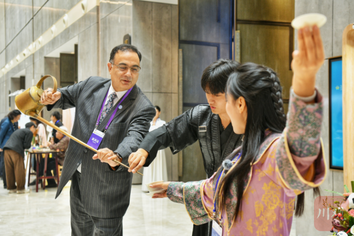 30日上午,天府国际会议中心的论坛举办地,与会专家学者步入会场前,被专门布置的四川文化遗产保护实践展吸引了眼球。展览上不仅有青城山、都江堰等四川文化遗产的精美图片,还带来了长嘴茶壶等非遗表演以及石窟数字化利用的项目展示,不少海外嘉宾借机体验了一把茶艺表演。
