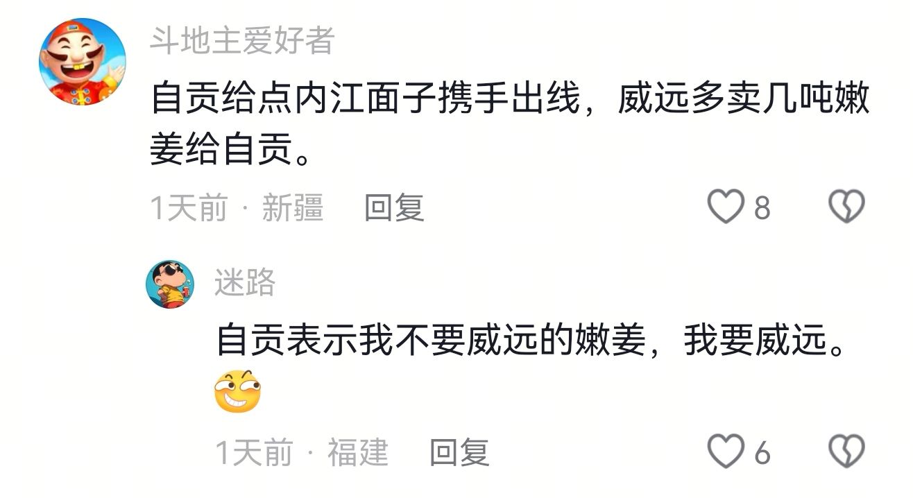 从揭幕战打到现在,在各大城市球迷见缝插针、叽叽喳喳的“安利”下,相信广大吃瓜群众和我一样对21市州的土特产有了更深刻的认识。比如,内自兄弟赛前就先上演了一场“威远之争”↓