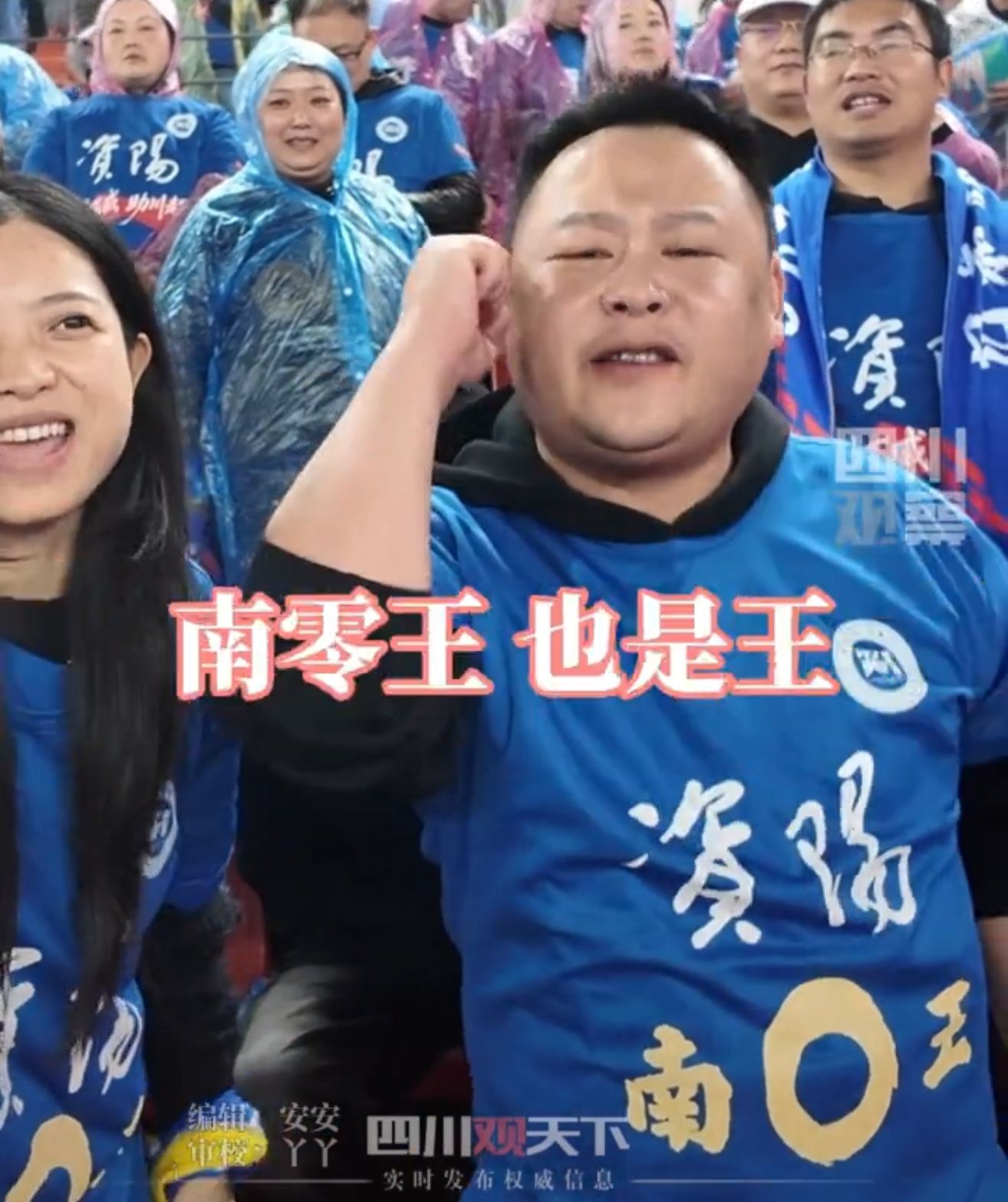 不是我瞎编,是球迷们自己传出去的。不信你看,南边资阳的位置更是坐得稳,“南0王”三个字已经印在应援服上、被资阳球迷穿在身上了。