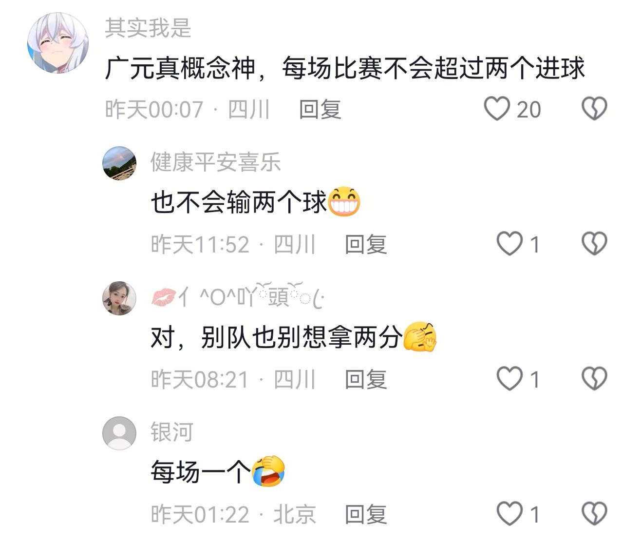 咋回事?请看比分:阿坝0-1广元。六场比赛下来,广元要么进一颗赢球,要么丢一颗输球,要么和对手一家进一颗打平,谁来都是一颗球,公平对待每一场比赛,怎么不算“广平王”呢?