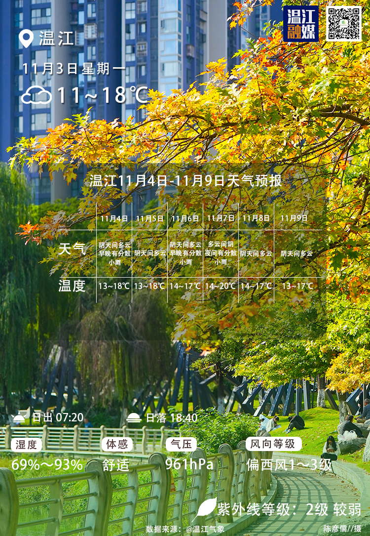 11月4日(周二)阴天间多云,早晚有分散小雨,气温13~18℃;