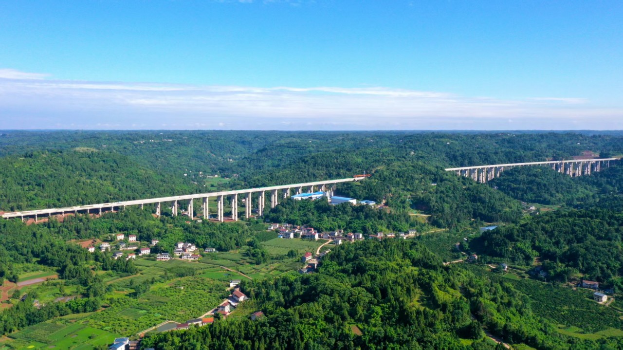 铜资高速月亮坝大桥和吴家沟大桥同框航拍。