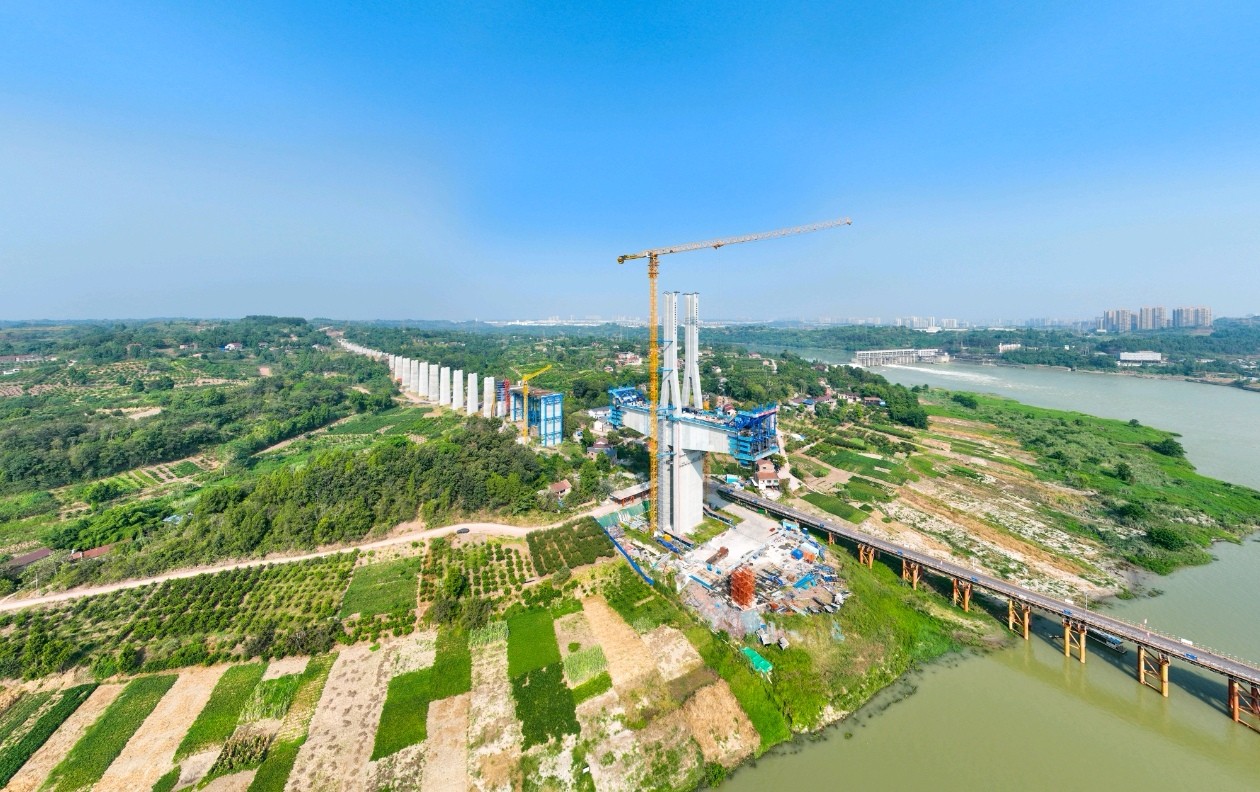 成达万高铁资阳沱江特大桥主塔封顶。全媒体记者 张建 摄。