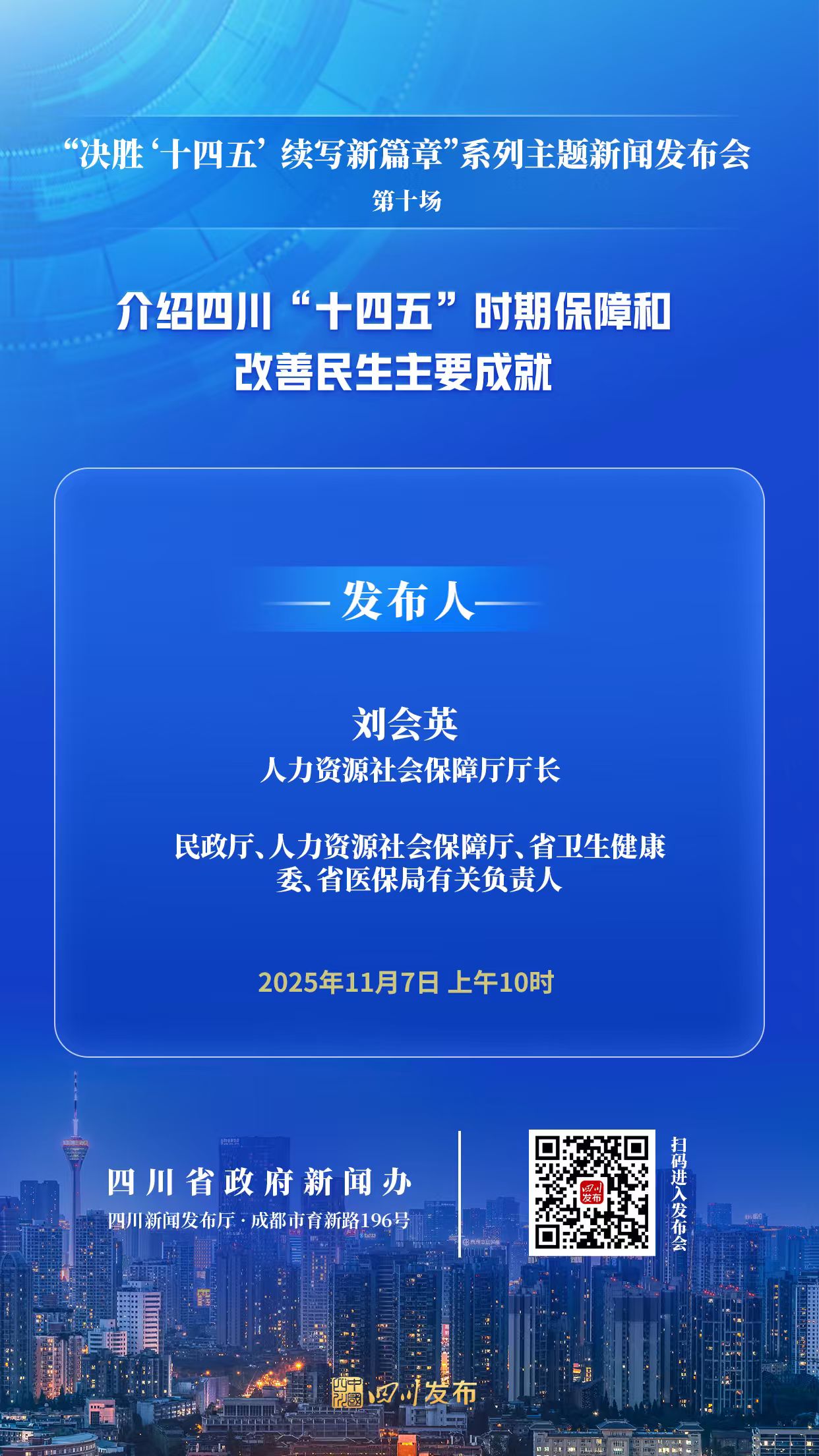 2025年11月7日(星期五)10:00,省政府新闻办将在四川新闻发布厅举行“决胜‘十四五’ 续写新篇章”系列主题新闻发布会第十场,人力资源社会保障厅厅长刘会英围绕四川“十四五”时期保障和改善民生主要成就作介绍并答记者问,民政厅、人力资源社会保障厅、省卫生健康委、省医保局有关负责人参加答记者问。四川发布客户端将全程图文直播,敬请关注!