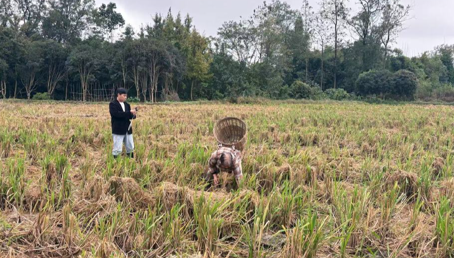 林志鹏与外婆正在稻田里拍摄视频素材。
