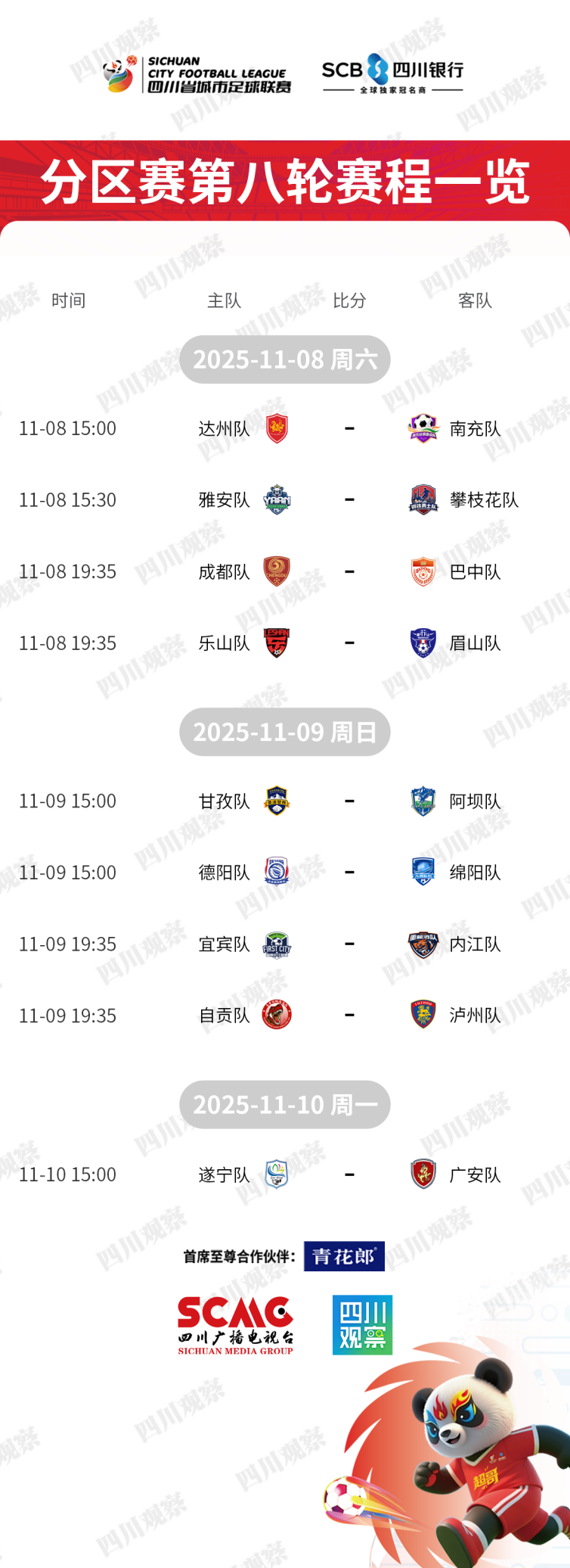 2025/2026四川银行四川省城市足球联赛分区赛第八轮将于11月8日开踢!本轮的9场对决将分别于11月8日(4场)、9日(4场)和10日(1场)三个比赛日进行。为了方便各位球迷朋友观赛,观观整理了比赛日程,请查收!