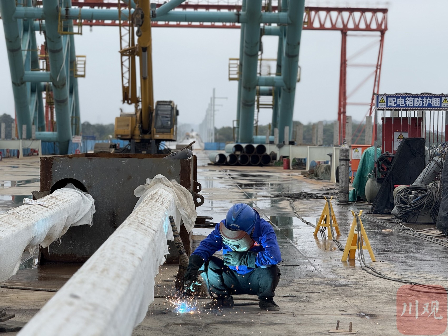 桥面上,工人正在做最后的焊接工作。跟以往大桥合龙的推进式不同,沱江特大桥采用张拉方式。也就是说,在两侧桥梁板一点点向中心铺设到约20厘米距离时,最后一片钢梁不再吊装铺设,而是把两边的桥梁体向中间拉近,先拉紧再锁死,最后由工人手动焊接,将两侧桥梁合龙。“最后一次张拉中,12台600吨连续千斤顶,用力约5400吨,过程历时近3小时,张拉合龙精度达标。”中铁大桥局成渝中线项目总工马天亮说。
