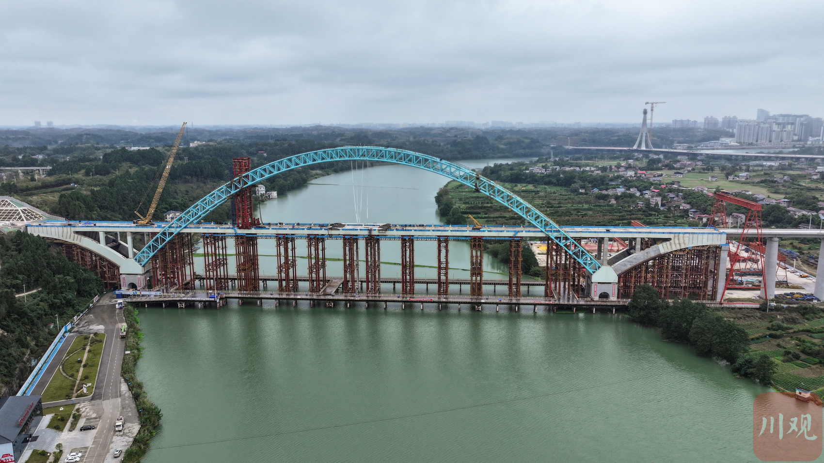 从成都市区驱车前往简阳市石钟镇,沱江边上,一座蓝色钢铁拱桥架在离河面百米高的空中。桥拱如弯弓,桥梁如弓弦,随着10日凌晨的合龙,稳稳地“绷”在两岸。
