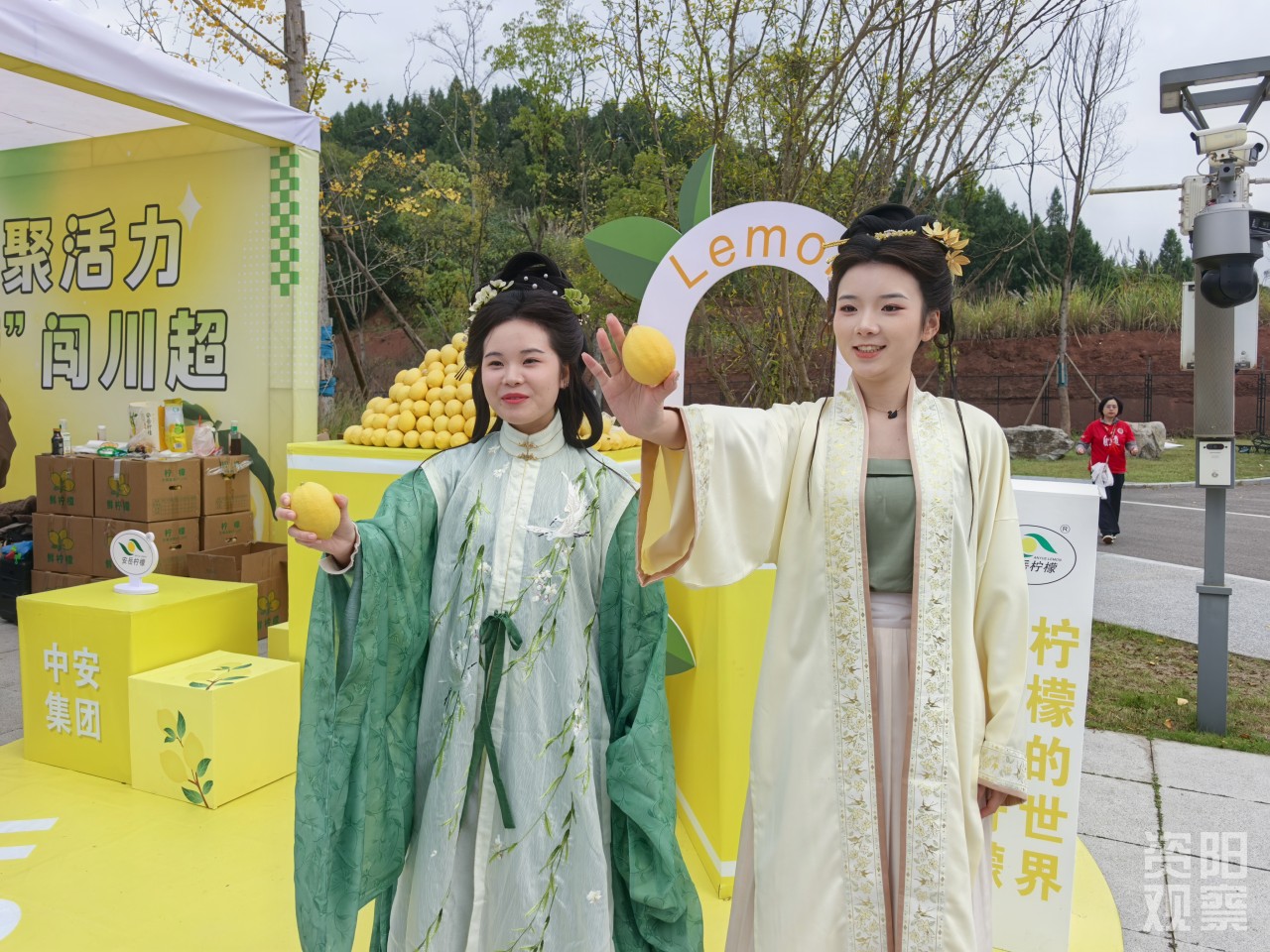 比赛尚未开始,安岳县展区前一黄一青两道身影格外引人注目。谭杨和廖丹丹两位安岳姑娘,正站在柠檬展台前拍照打卡,还不忘热情地向路过的自贡球迷“安利”安岳柠檬。