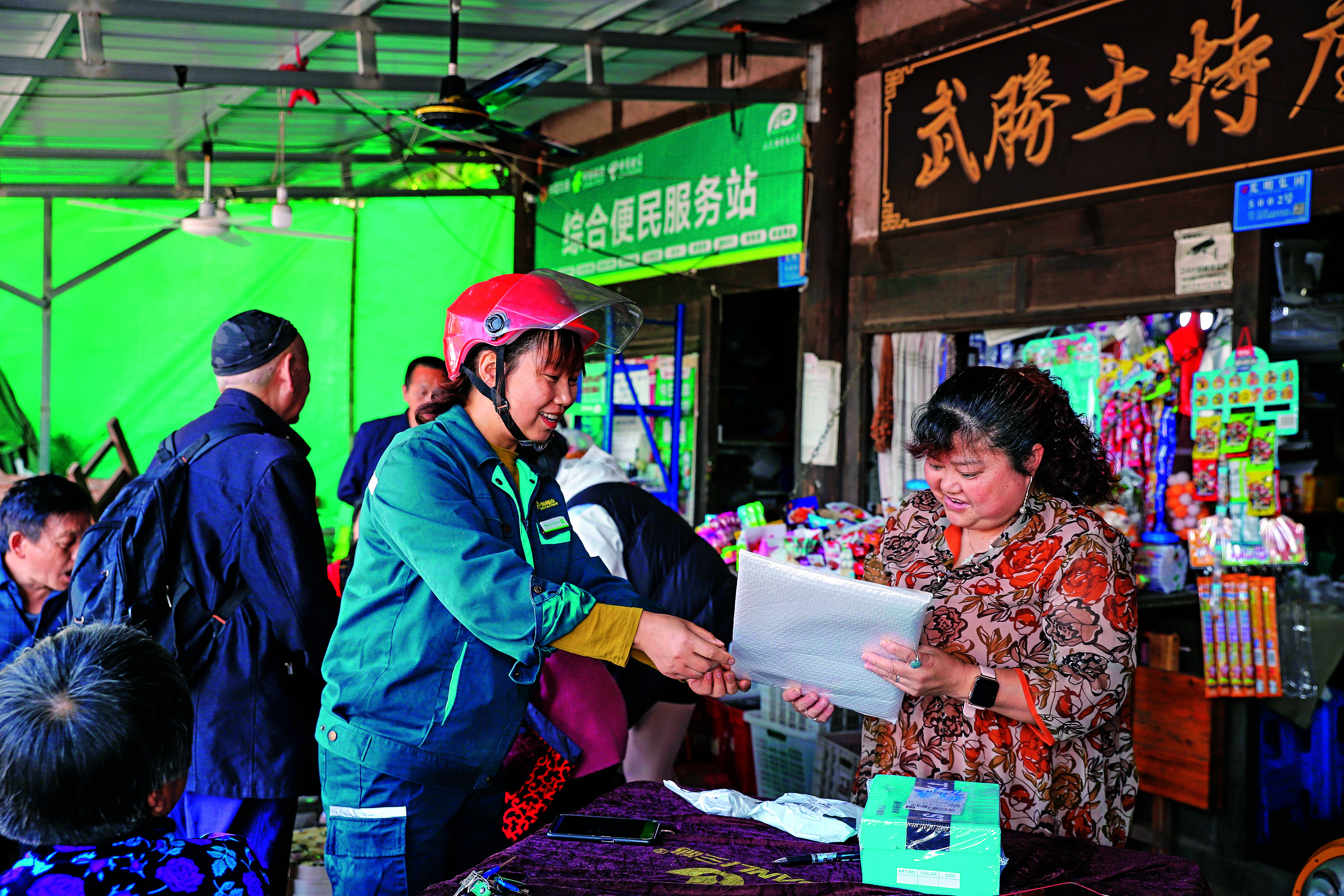 11月14日一大早,在邻水县复盛镇光明村三组余家梁子的邮政快递驿站,店主冯碧珍利索地收拾好包裹,骑上电动车,开启了当天的送件之旅。