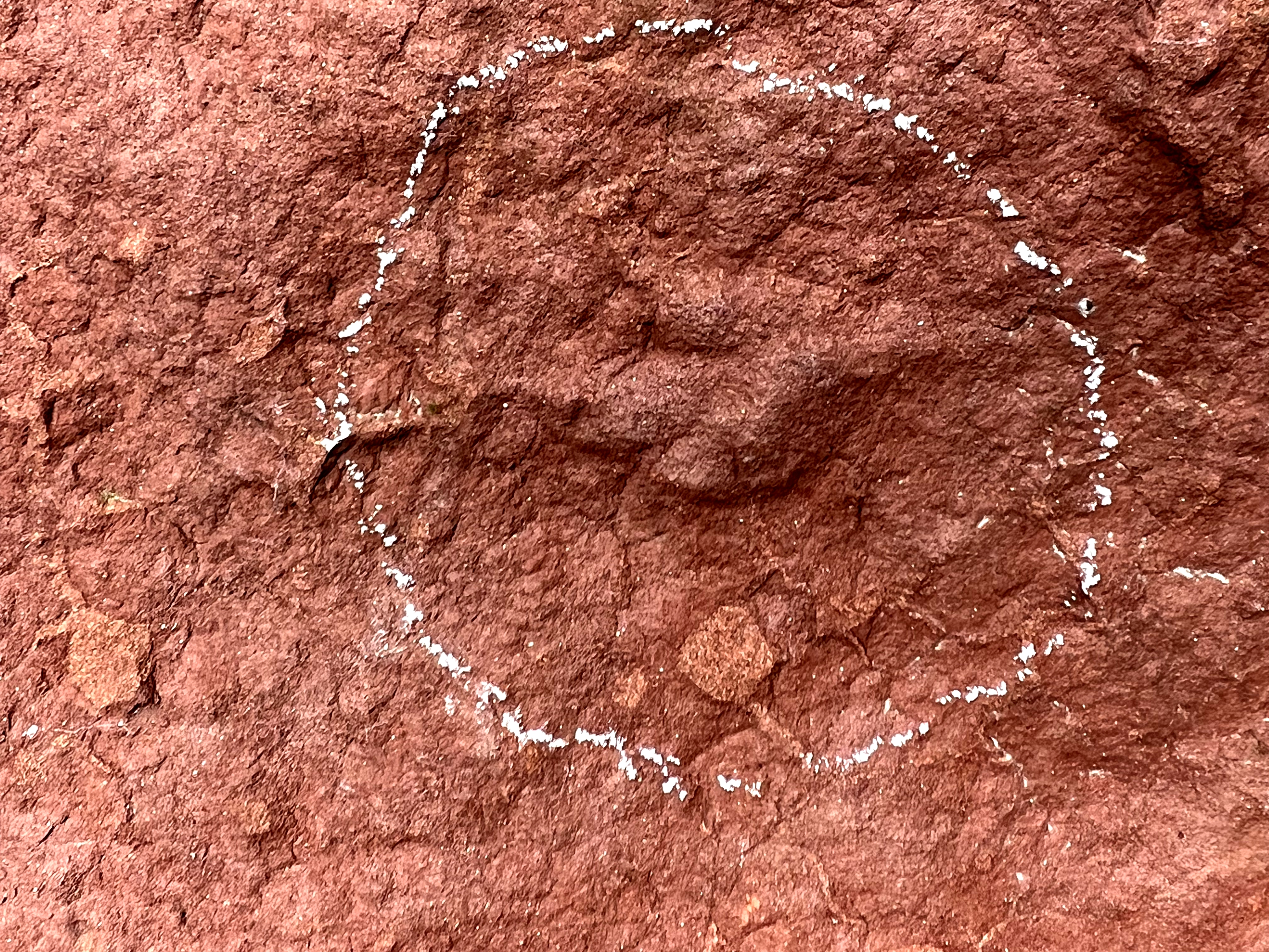 看似平淡无奇的砂岩石平面,几个凹凸有致的图案,经地质专家用粉笔描画,轮廓逐渐清晰,再用几条线连接,一组形似动物运动行迹的示意图便跃然石上。
