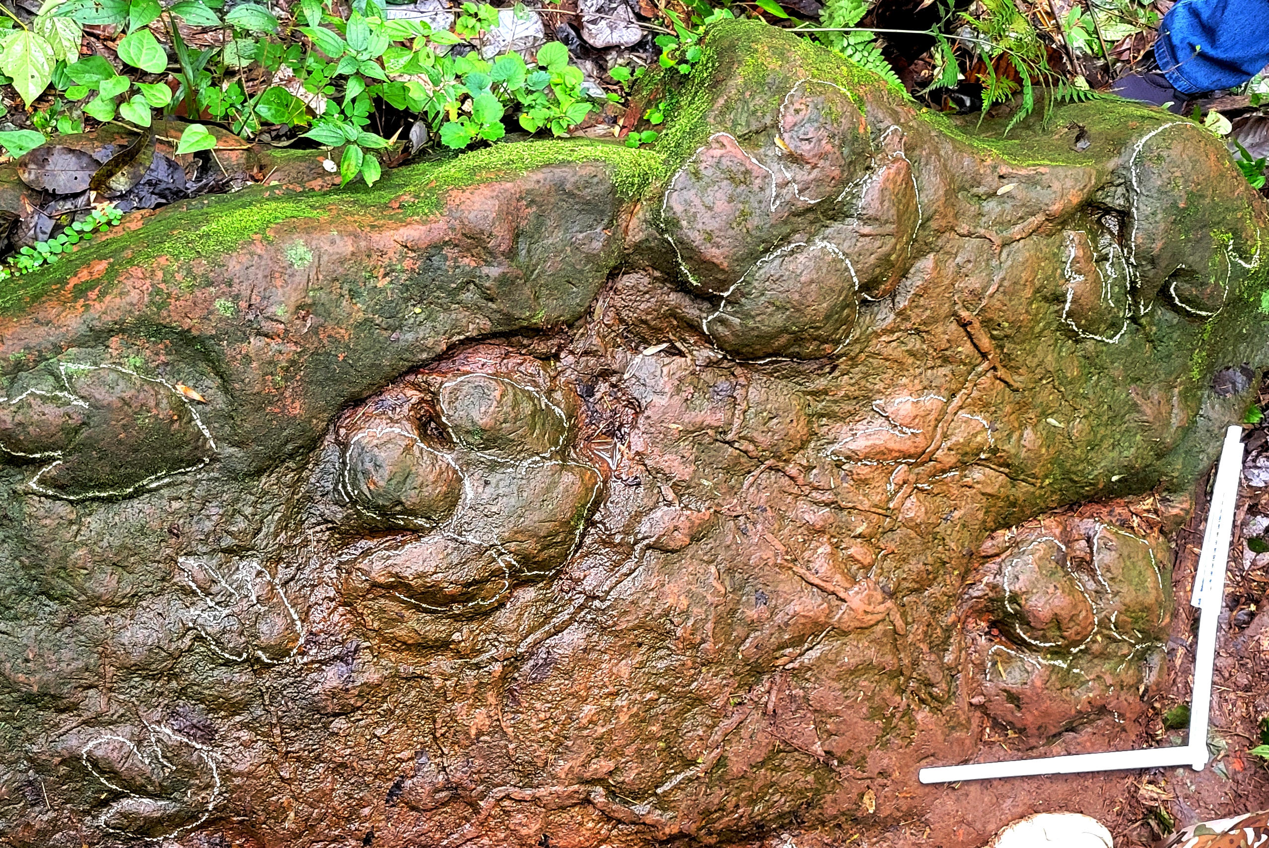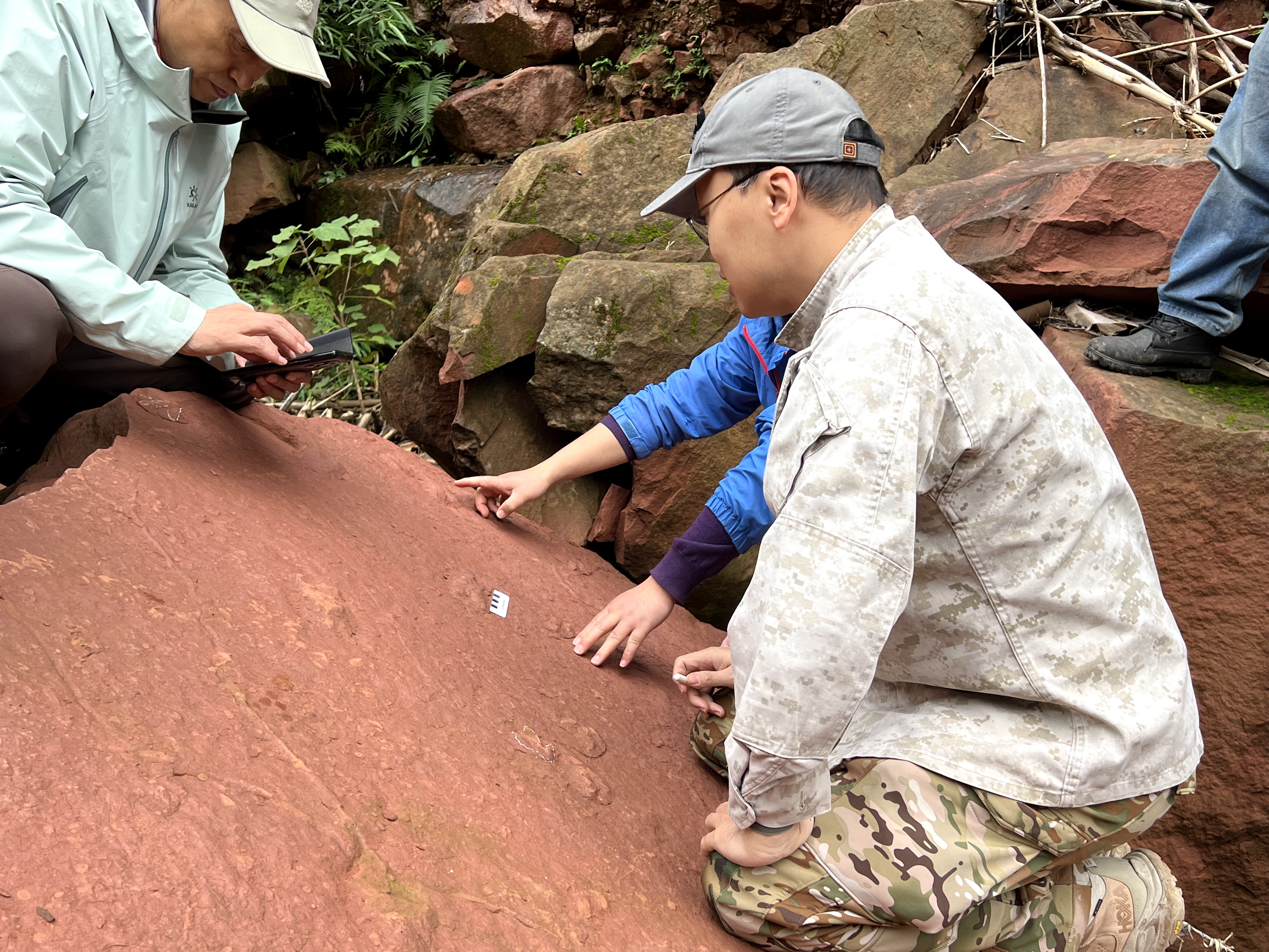 “轮廓直径达20厘米左右的是大型蜥脚类恐龙足迹,旁边这些像‘鸡爪’一样的则是兽脚类足迹,可见当时的古蔺恐龙家族十分繁盛。”跟着调查团队跑了一段时间,徐挺对现场足迹化石也有了自己的判断,而他的分析也得到了现场专家的肯定。
