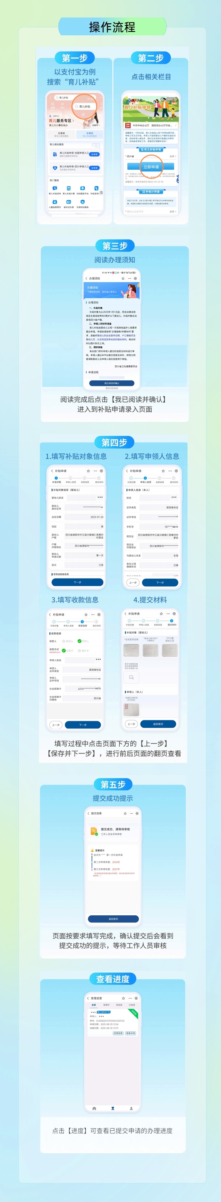 目前,四川提供“线上+线下”双重选择。申领人可通过支付宝、微信平台“育儿补贴”申领入口,进入育儿补贴信息系统。线下申请需到婴幼儿户籍所在地乡镇政府(街道办事处)现场办理。儿童福利机构应到机构登记地所在乡镇政府(街道办事处)现场办理。