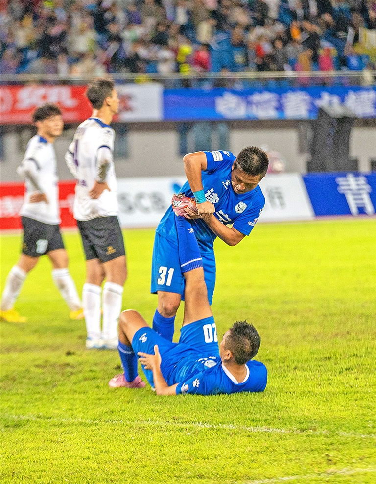 10月12日,遂宁舍得干队主场迎战南充丝绸源点队,球员进球后拥抱庆祝。 全媒体首席记者 刘昌松/摄