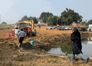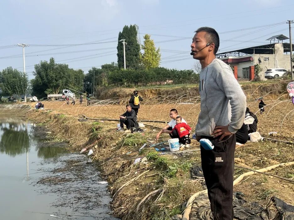 当记者刚走到鱼塘边,就看见一位皮肤黝黑头上戴着麦的男子骑着电瓶车从地里冲出来,他的后座上是一位NPC体验者。