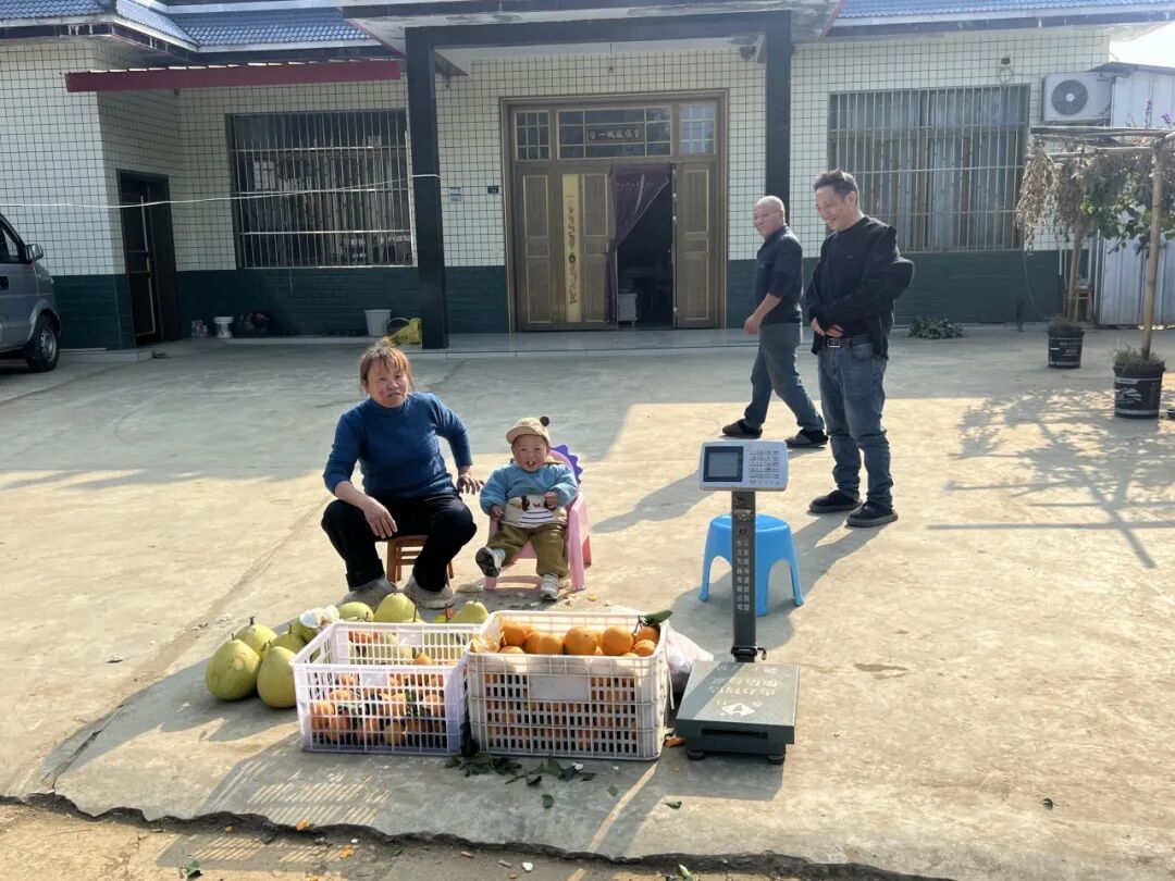 沿着村道往里走,是大片大片的果园,沿路的村民们都把自己的果子摘来放在门口,其中一个摊位,一个年轻又沙哑的声音从喇叭里传出:“妈妈我要吃爱媛,给我买一个嘛,好吃得爆。”