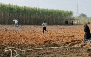 提鱼男从甘蔗地里出来,止不住的仰头大笑,隔着100米都能感受到那股被追逐的兴奋和激动,无法平息。这种儿时追逐的体验让围观的人们笑成一片。