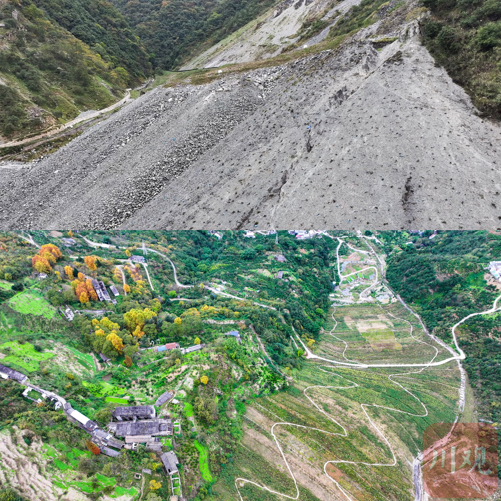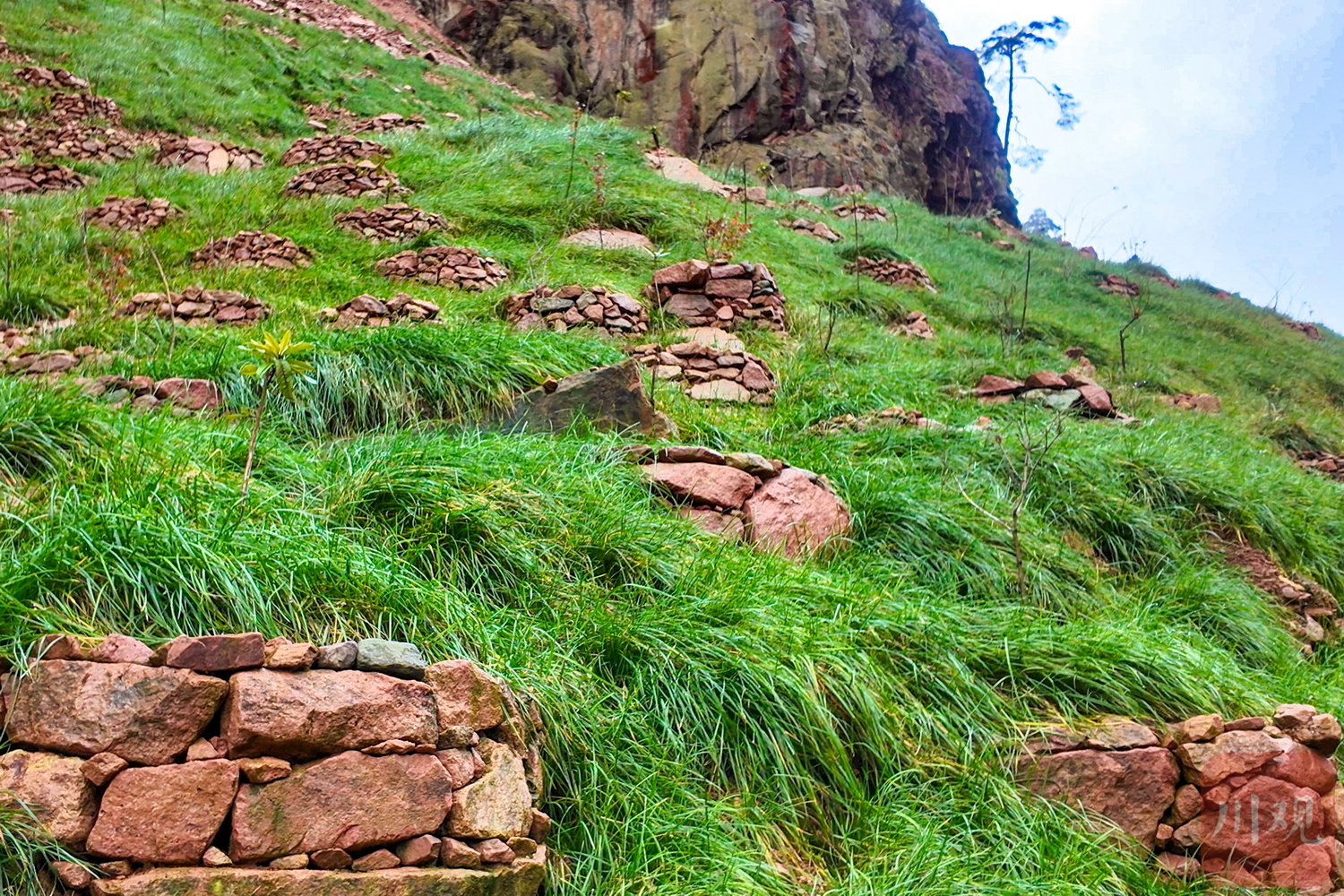 此外,修复区还新建输水渠系统。山坡上的毛细血管般的水槽,在汛期引导雨水汇入主渠,最终流入河中,有效降低地质灾害风险。