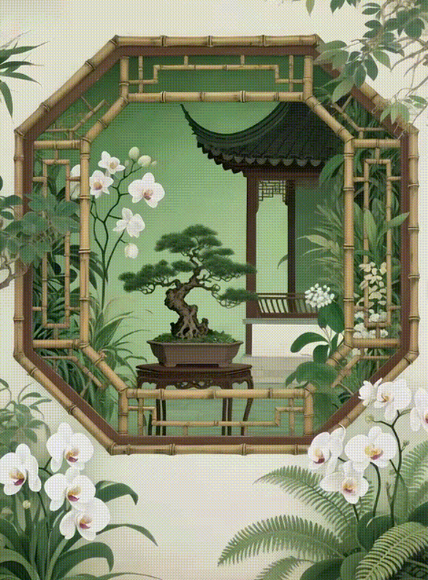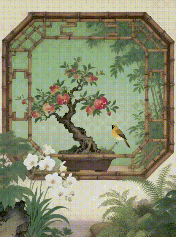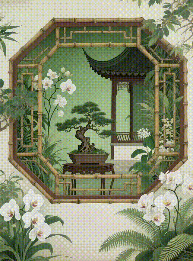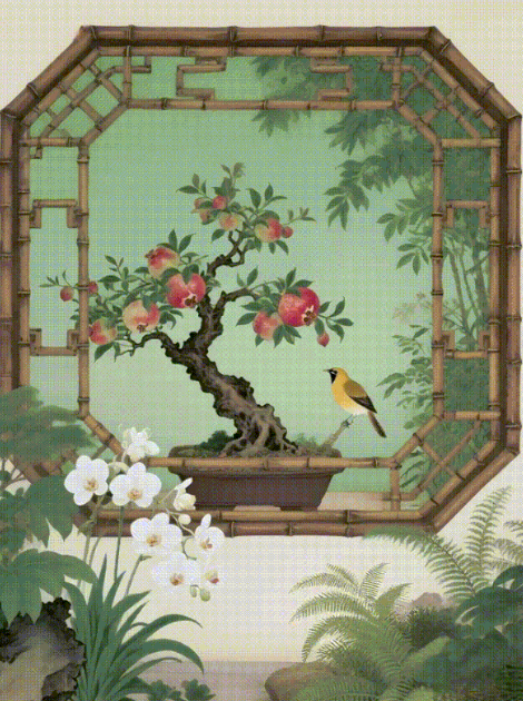 该作品以中式窗景为核心,搭配盆景、花鸟、亭台等元素,展现盆景艺术精巧之美与中式园林韵味,传递人与自然和谐共生的情感,呈现在丝巾、明信片、帆布袋等物品上。