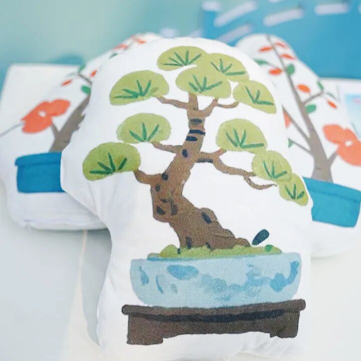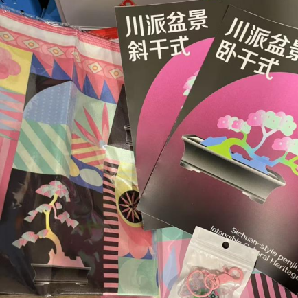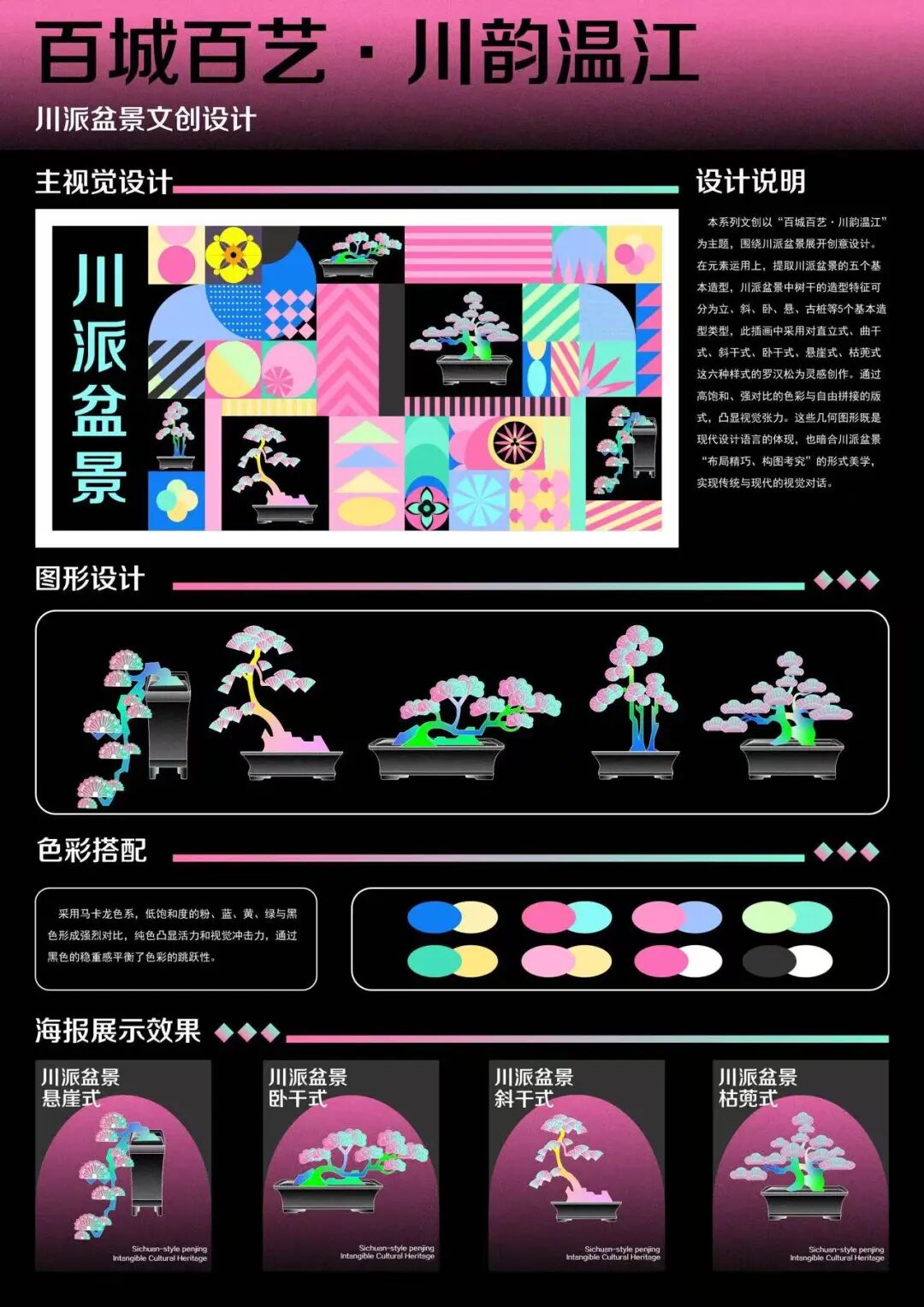 该作品以包装袋、徽章、钥匙等为载体,以六种罗汉松样式为灵感创作插画,用高饱和对比色彩与自由拼接版式,以现代设计语言呼应川派盆景的精巧构图美学。
