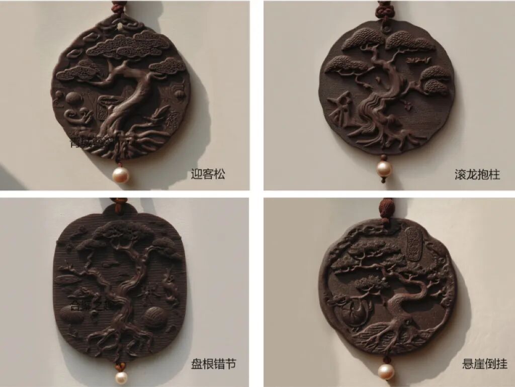 该作品以可佩戴香牌为载体,以川派盆景造型法则与空间美学为灵感设计香牌,将盆景立体形态转化为浮雕纹样,实现非遗从观赏性到实用性美学的转化。