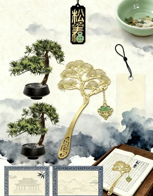 该作品以金属等书签为载体,融合川派盆景造型神韵与现代文创设计,融入“松寿福”吉祥寓意,让传统盆景艺术走进大众生活。
