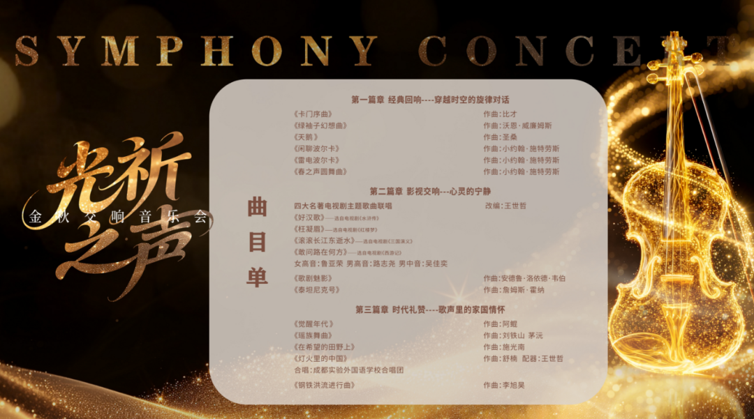 音乐会精心设计了经典回响——穿越时空的旋律对话、影视交响——心灵的宁静、时代礼赞——歌声里的家国情怀三个华彩乐章。曲目编排丰富多元,从中外经典到时代新声,每一首都承载着不同的情感与故事。