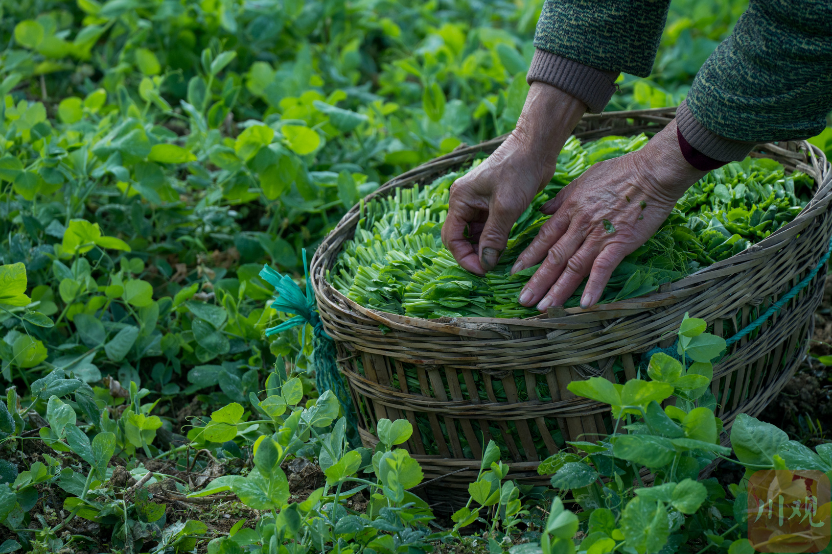 指尖在藤蔓间轻捻慢放,嫩得仿佛能掐出水的豌豆尖便成把落入筐中——不到一个小时,竹筐里已堆出一圈圈鲜绿的螺纹,叶尖上的水珠顺着弧度向下滑落,成了田埂边最灵动的“装置艺术”。