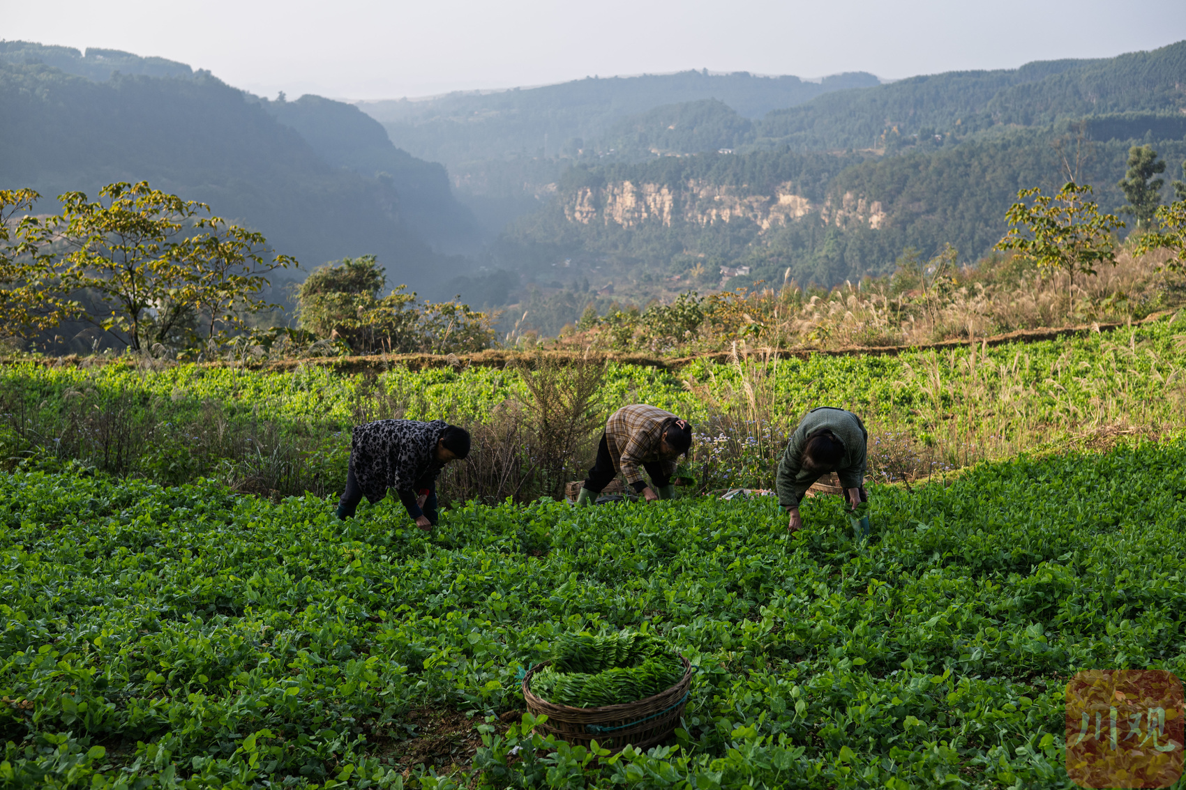 12月1日清晨,自贡市荣县杨柳沟村的田间,豌豆苗上缀满露珠。58岁的刘金华已将竹筐摆在田埂旁,开始采摘豌豆尖。