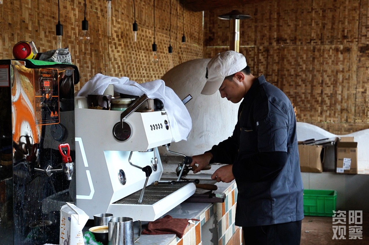 1997年出生的向铃铃从德阳而来,带来了DIY咖啡、窑烤面包、创意菜等传统乡村缺失的新吃法。“城里人来乡村,寻找的是一种‘松弛感’。”他一边熟练地萃取咖啡液一边说,“我们提供的咖啡、窑烤面包、西餐,正是这种体验的一部分。”