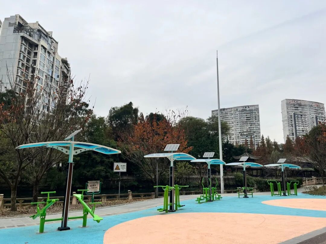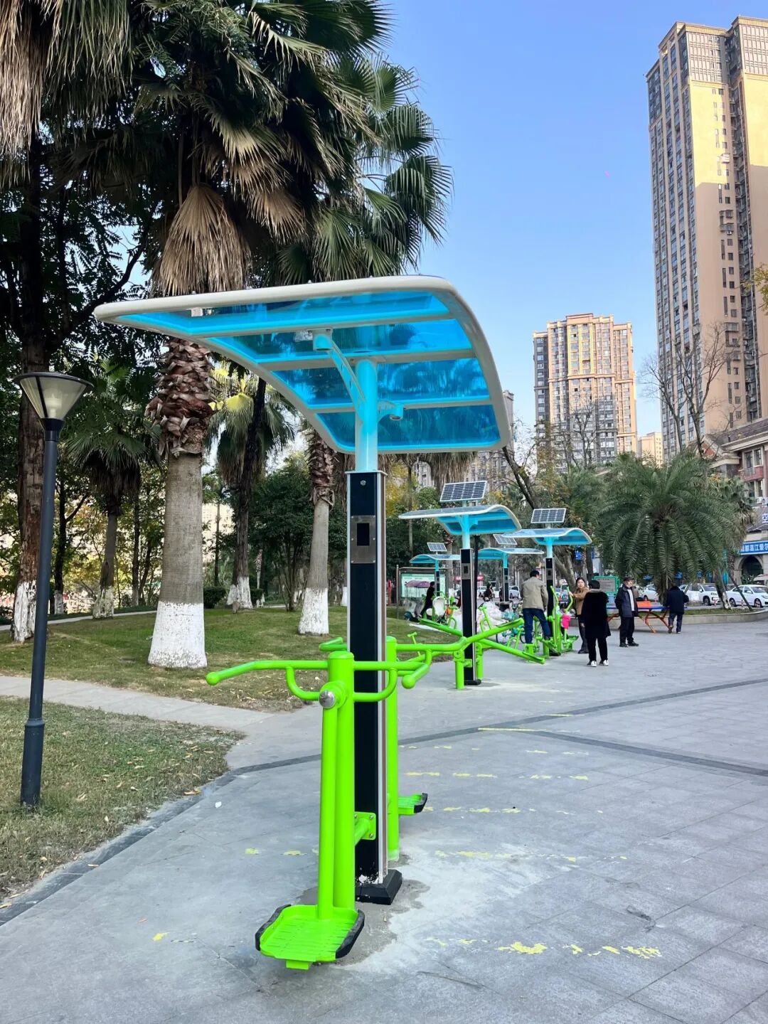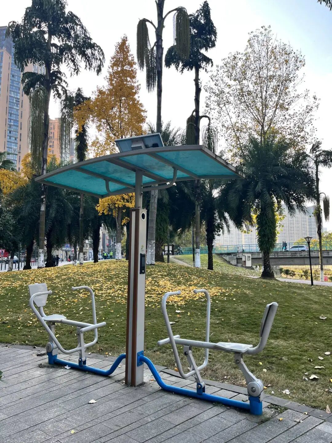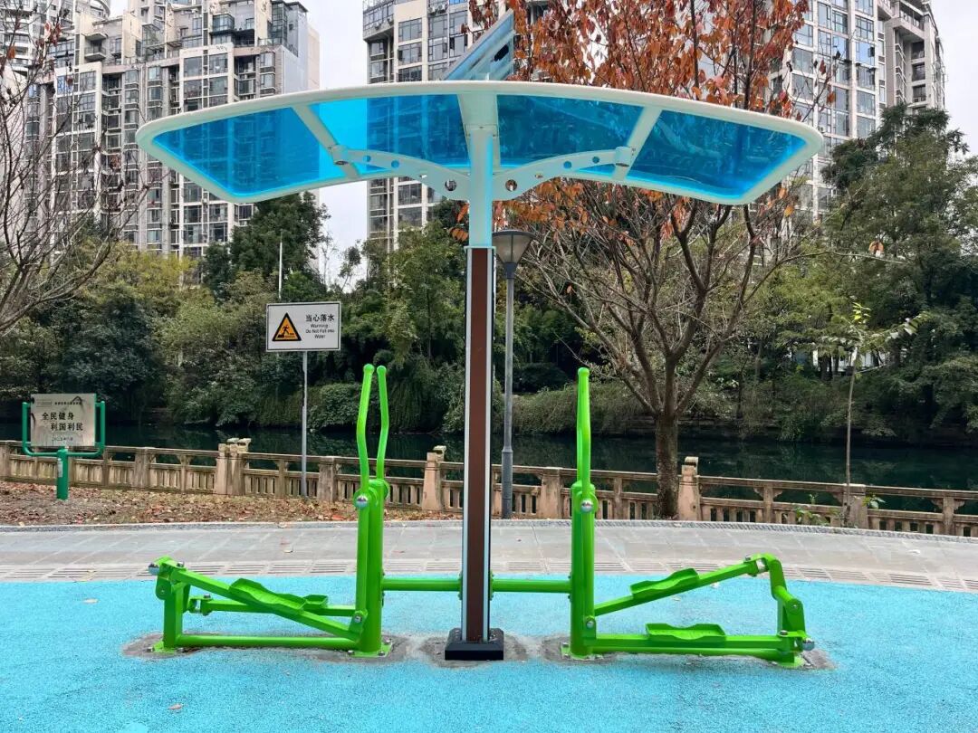 崭新的太空漫步机、钟摆器、椭圆机、腰部按摩器、跷跷板等设施一应俱全,满足了不同年龄段居民的锻炼需求。太阳能供能的计数表盘,让运动者对自己的锻炼时长、次数和预估热量消耗一目了然,让健身变得更科学;采用环保塑胶铺设的地面,具有良好的冲击吸收性,呵护老人和儿童的安全;新增的自带雨棚设计,让健身活动变得风雨无阻,真正实现了“随到随练”,大幅提升了设施的全天候使用率。